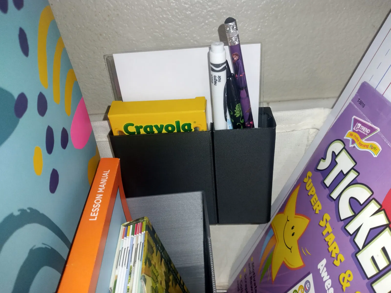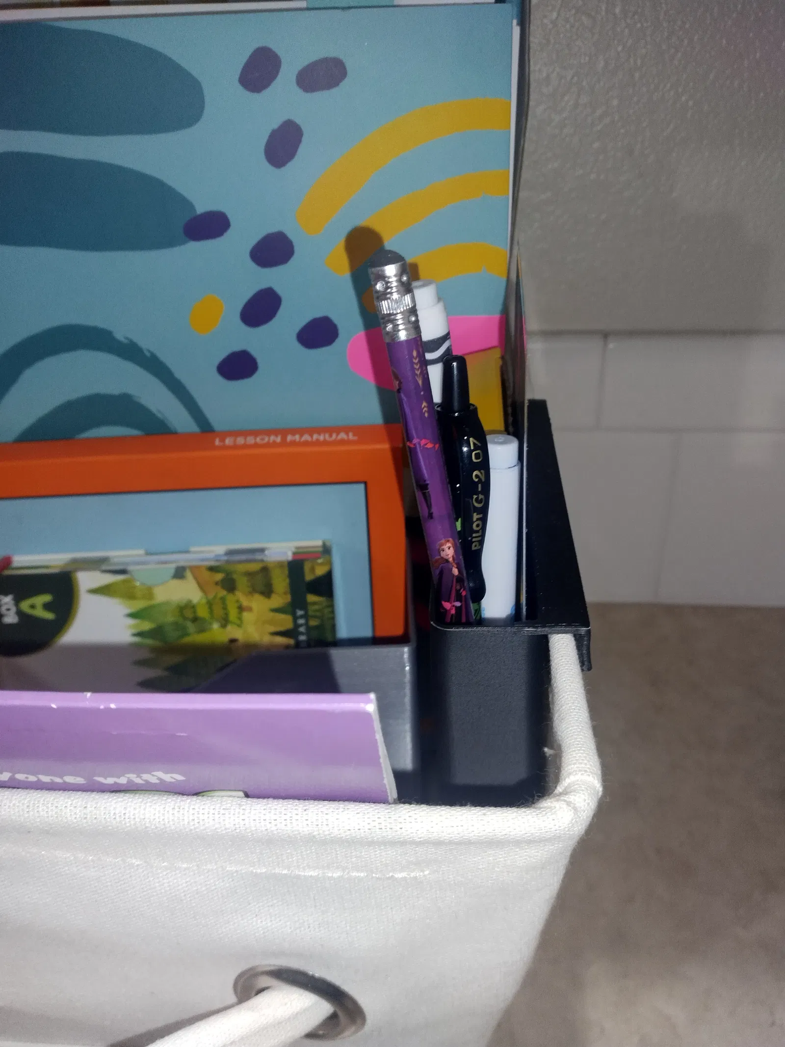 Hộp này treo trên mép giỏ, đựng bút chì, bút sáp và các vật dụng linh tinh khác, cùng với một thẻ cán màng có kích thước bằng chiều rộng của hộp.