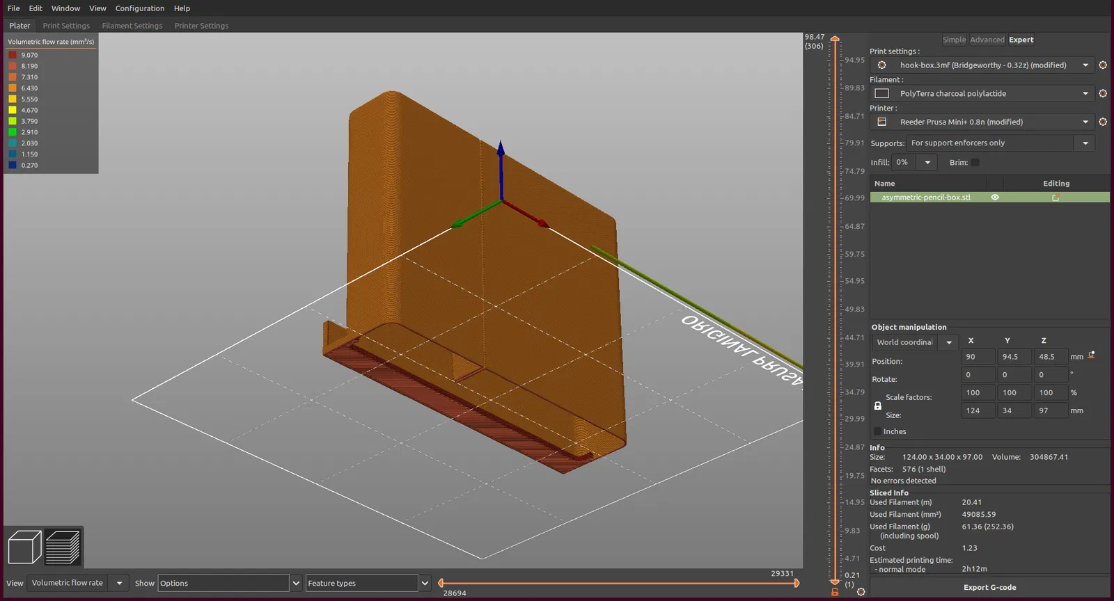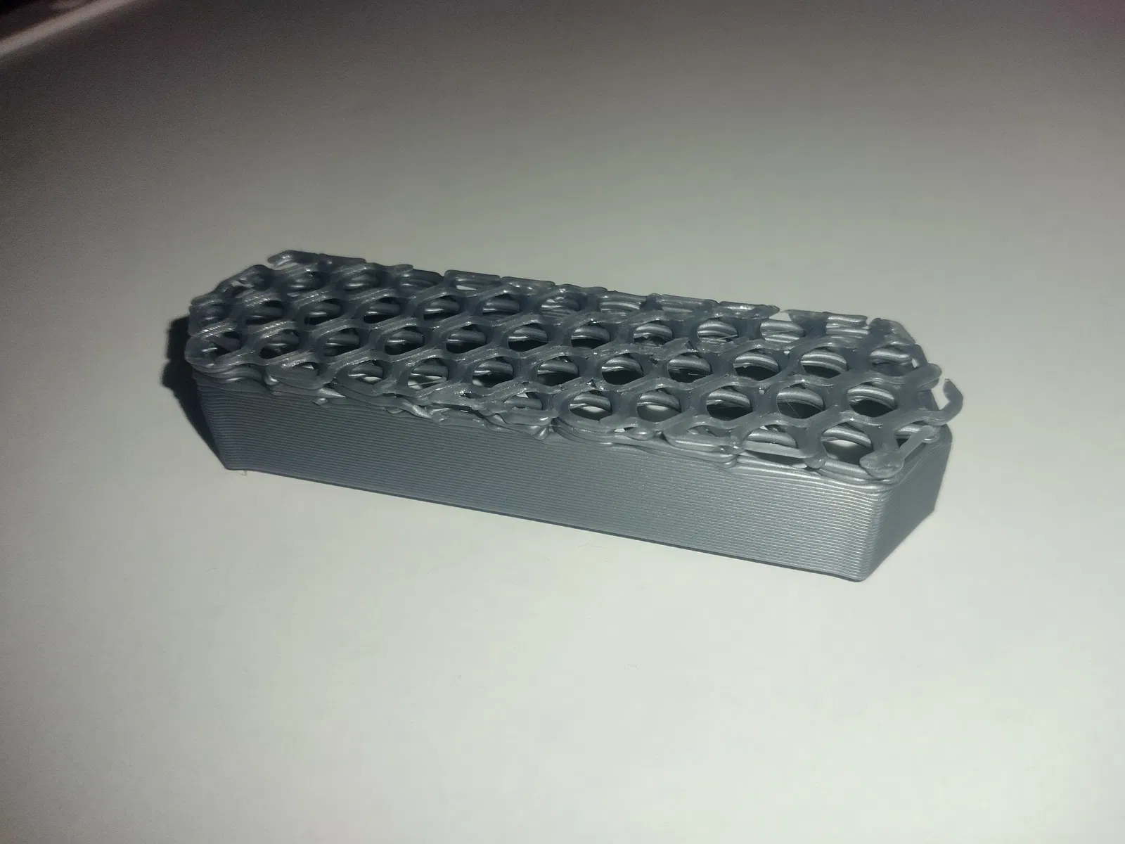In không có vật liệu độn (infill) và không có lớp đáy đặc. Chỉ cần đủ lớp đỉnh đặc để phần móc nối với phần còn lại của hộp, chúng bắt đầu từ lớp đáy. Sử dụng vành (brim) để cải thiện độ bám dính trên bàn in.