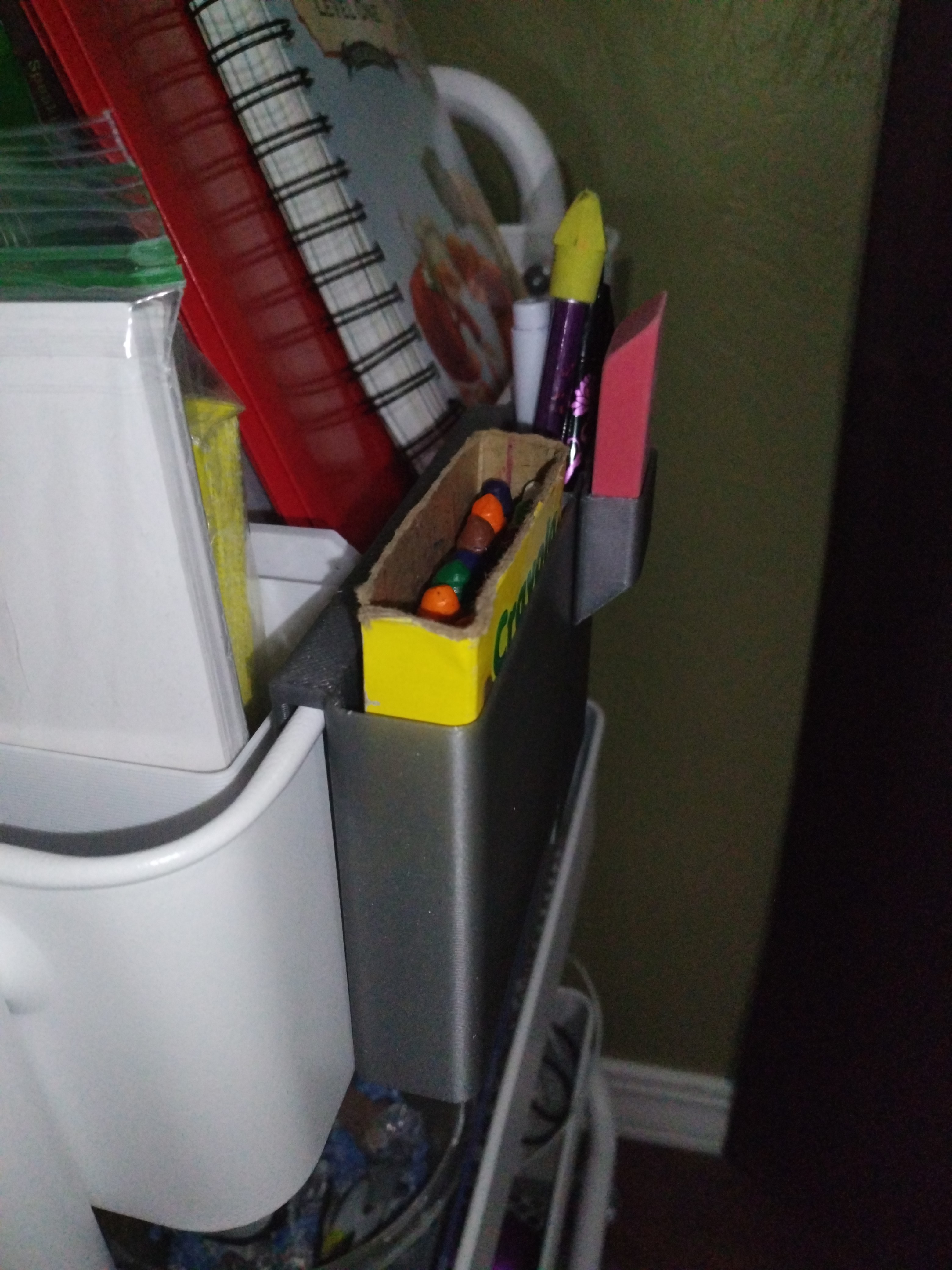 Một hộp nhỏ nhiều tầng để đựng đồ dùng học tập, có móc để treo trên cạnh hộp. In với 0 lớp đáy và 0 lớp ruột, nhưng với ít nhất 3.5mm lớp trên để hỗ trợ và làm chắc phần móc. Đề xuất dùng brim cho lớp đầu tiên bám dính tốt.