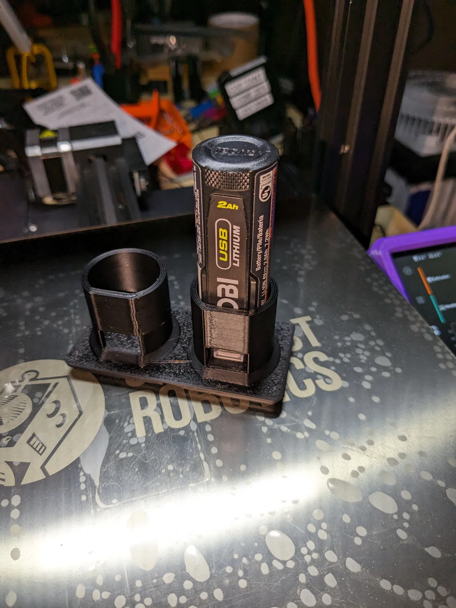 2 giá đỡ pin trên đế Gridfinity 2x1 (hoặc 1x2). Cho phép sạc pin. Tối ưu hóa cho các bộ phận in 3D.