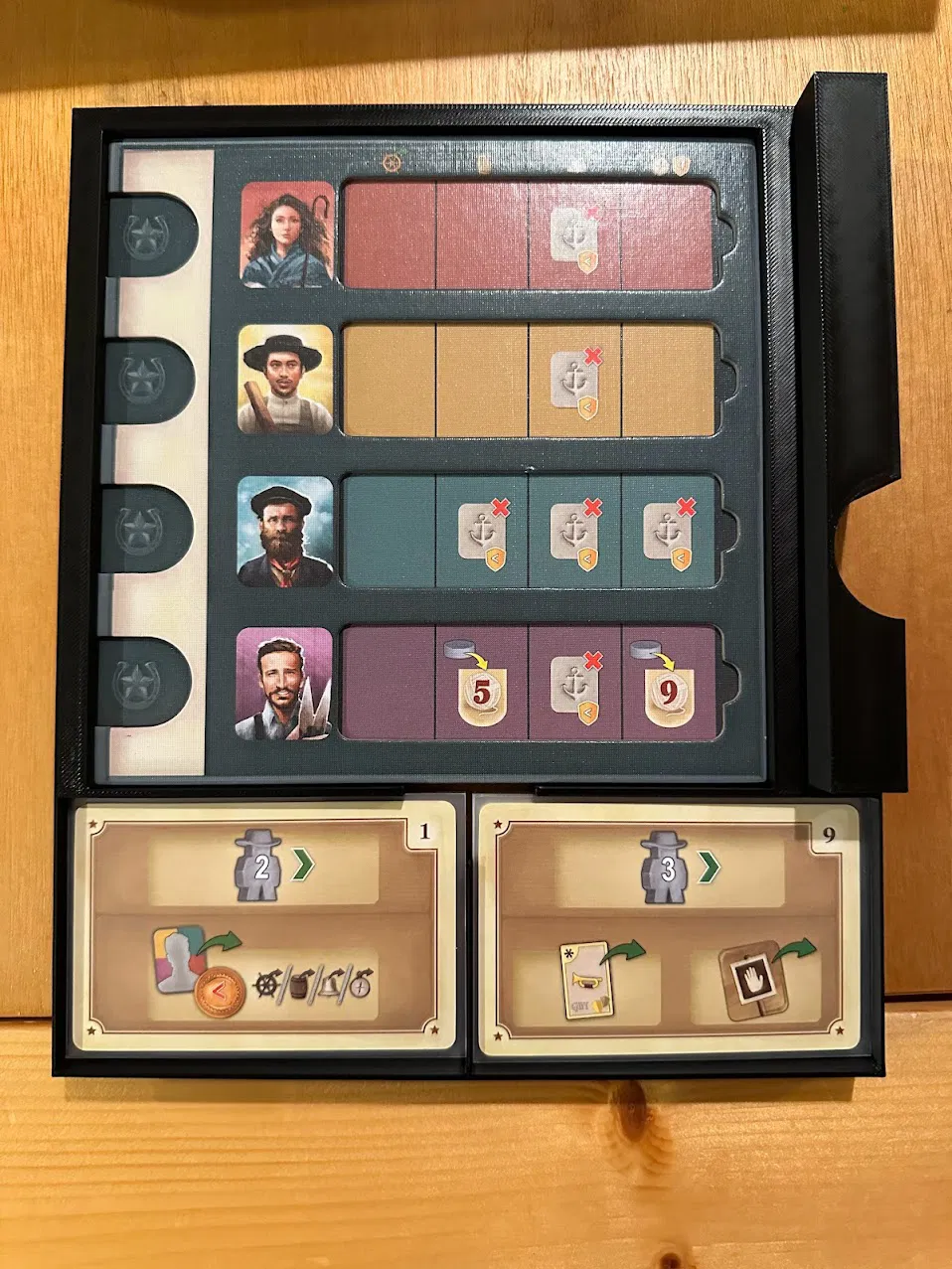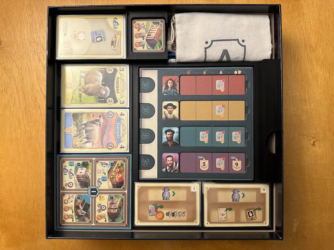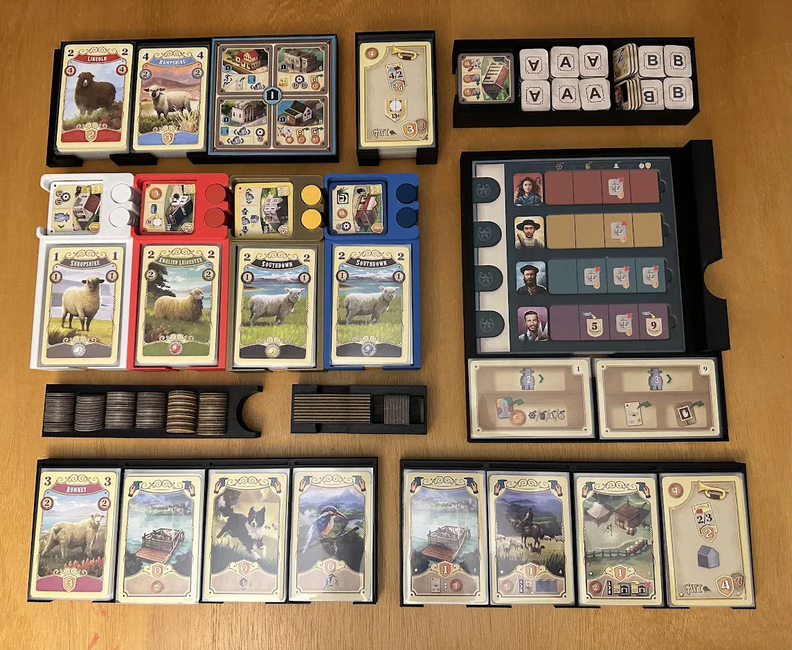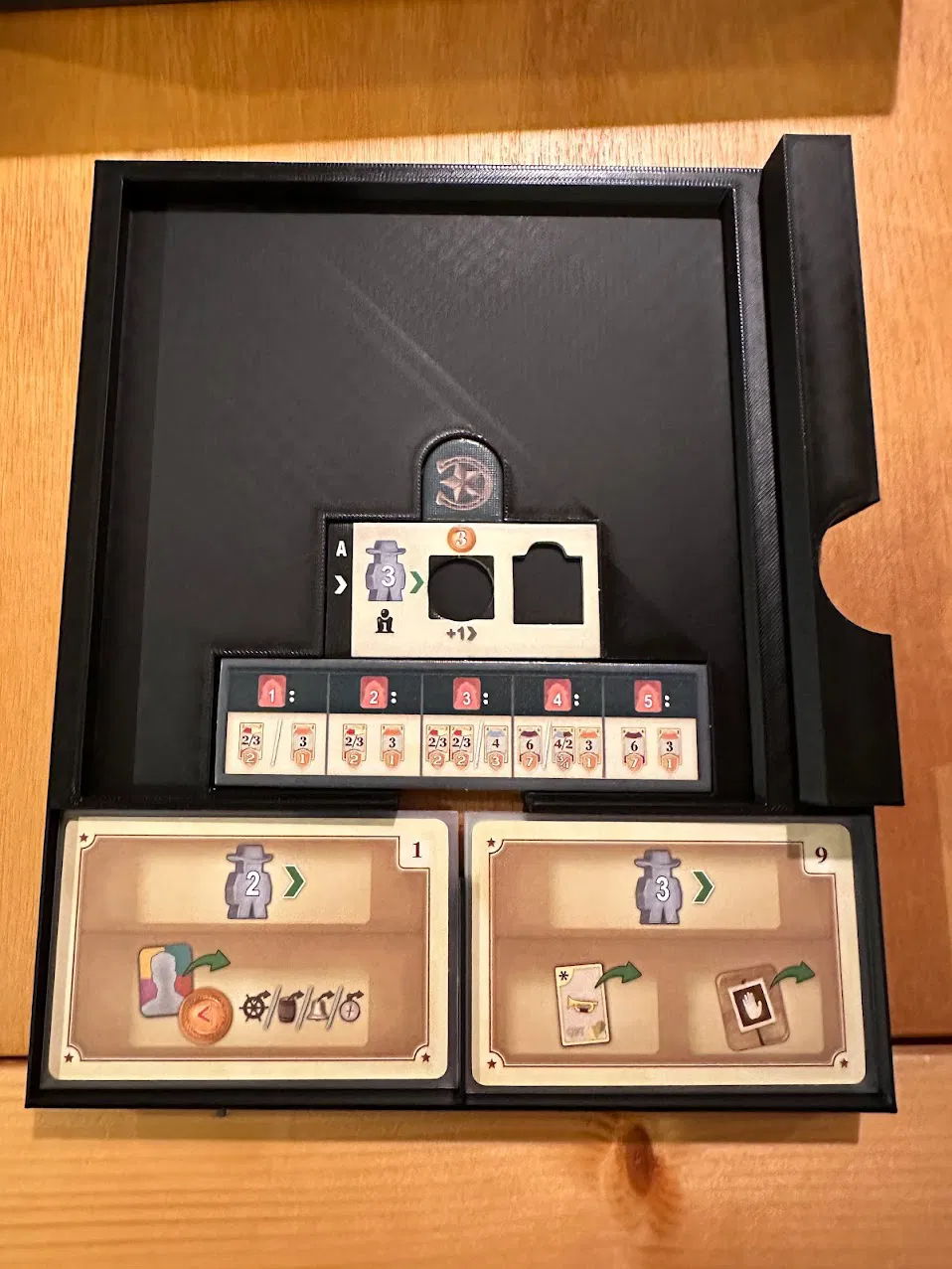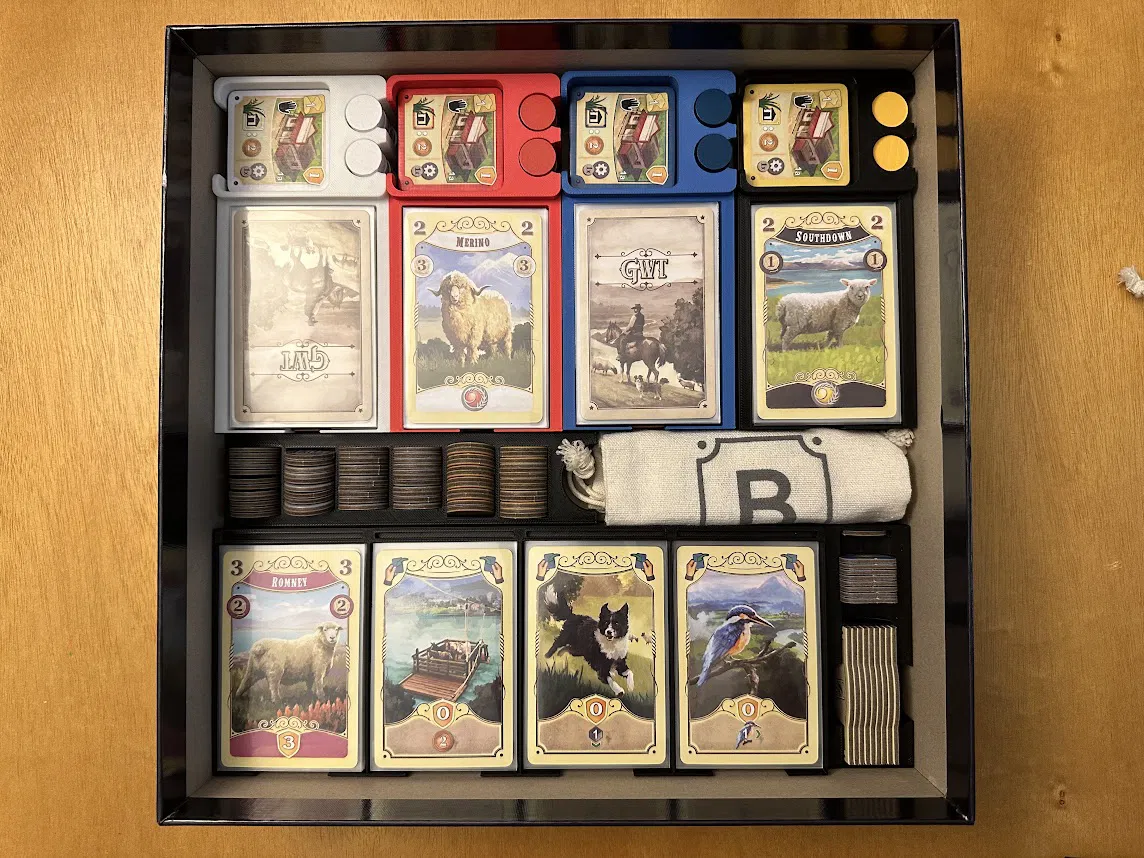 Thiết kế insert cho GWT: New Zealand giúp sắp xếp bàn chơi hiệu quả. Insert này tối ưu không gian hộp nông, hỗ trợ thẻ có bọc, có thể lưu trữ dọc, và cải tiến cho token A/B, khay tiền, khay solo/chợ. Hỗ trợ tốt cho người chơi có bàn in nhỏ.
