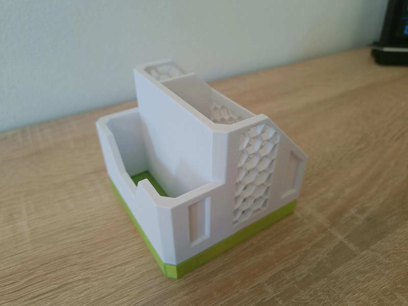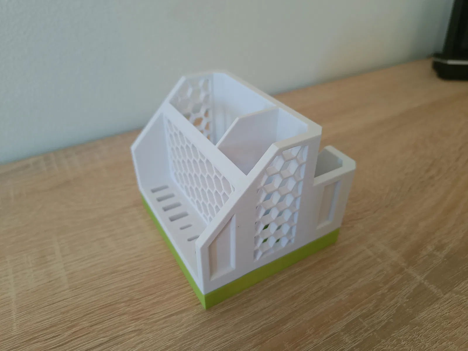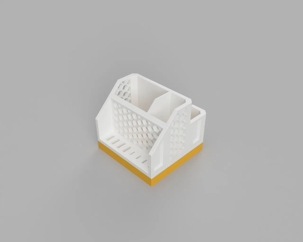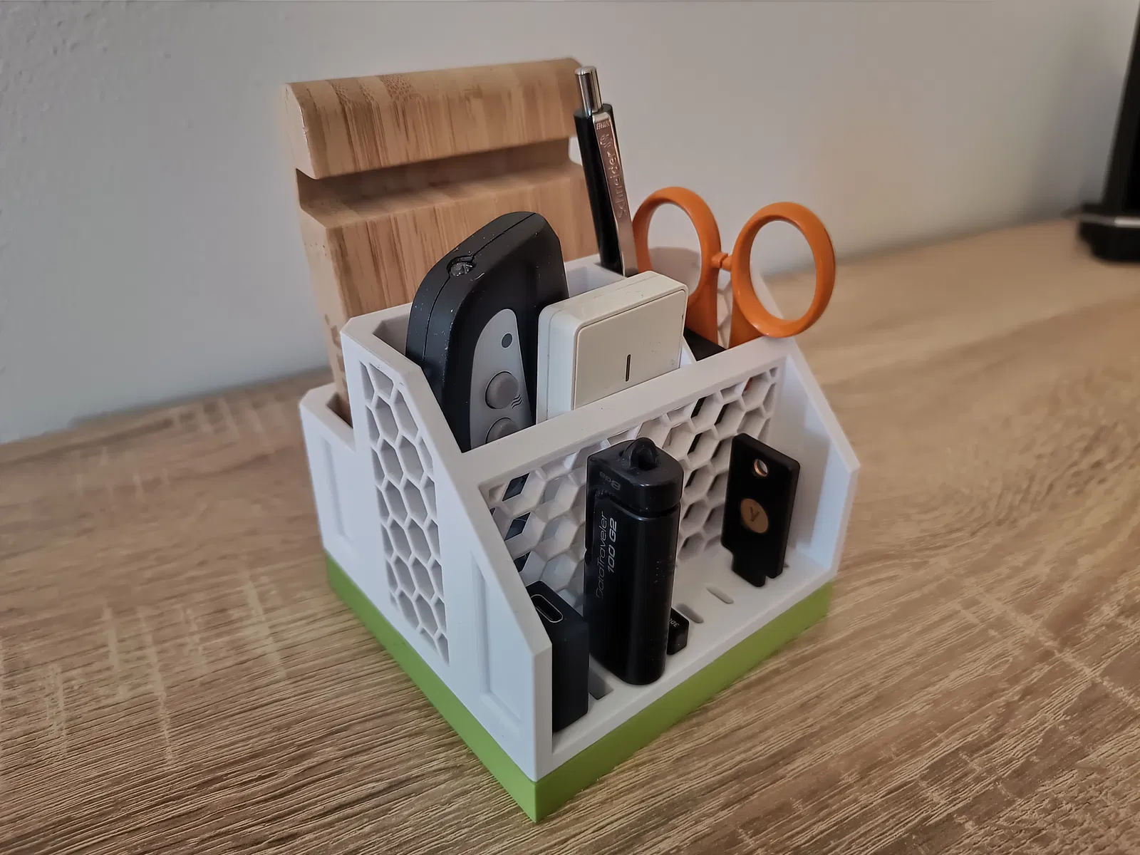 Hộp đựng đồ để bàn gọn gàng và phong cách với các khe cắm USB A và USB C, bút, và máy tính hoặc điện thoại. Phiên bản cải tiến với họa tiết lục giác, khe cắm USB-C và ngăn sâu hơn.