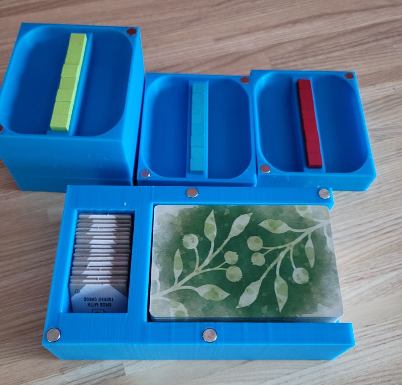 Các hộp đựng token người chơi, thức ăn, thẻ mục tiêu và thẻ tự động cho Wingspan, với nam châm giữ chúng gọn gàng trong hộp. Được thiết kế để phù hợp với bộ tổ chức đầy đủ của tôi.