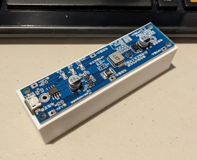 Hộp đựng cho bảng mạch bảo vệ và bộ giữ pin 18650 đơn lẻ, loại cung cấp mạch tăng cường kiểu UPS 5V/12V. Kích thước bảng mạch 89x22mm. Không cần hỗ trợ, nhưng cần chọc ra một lớp cho đầu vít M3. Yêu cầu bốn vít M3x10.