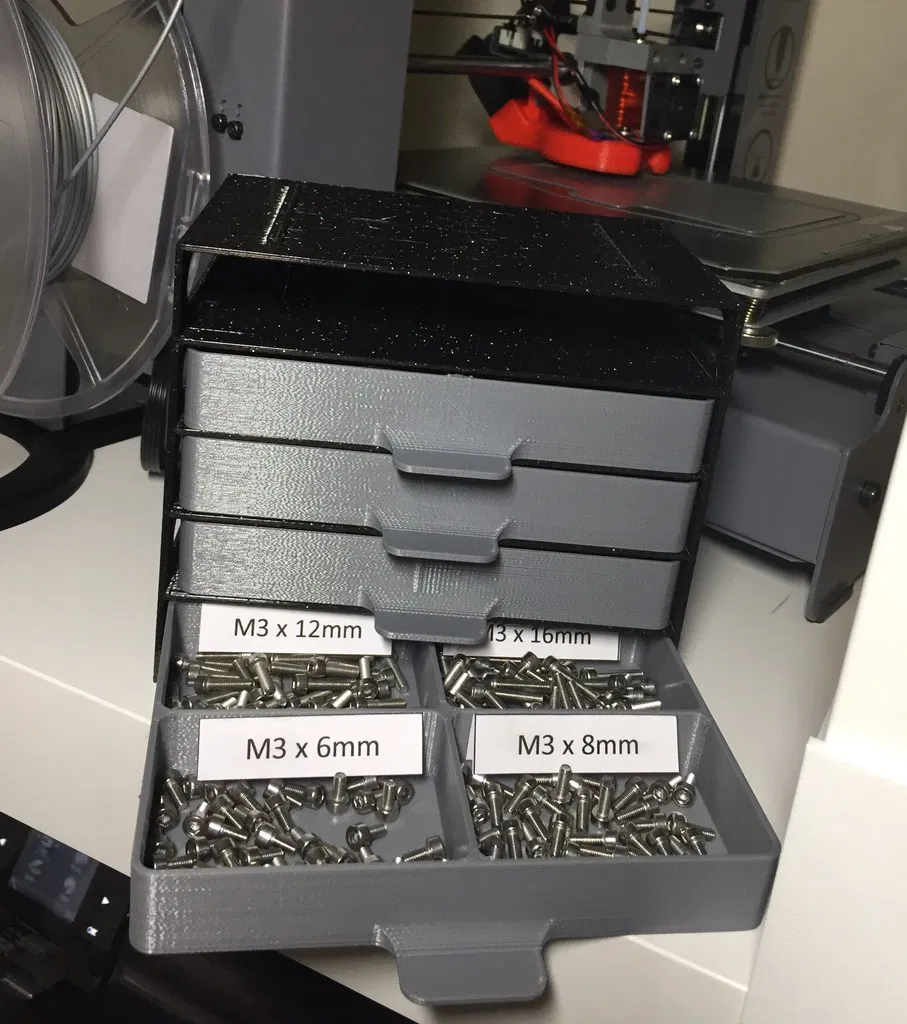 Thiết kế ngăn kéo rộng hơn để chứa nhiều bộ phận hơn và có thể xếp chồng lên nhau. Bao gồm các khay có 1, 2 và 4 ngăn. Cài đặt in khuyến nghị: Độ phân giải 0.3mm, Không Rafts, Không Supports.