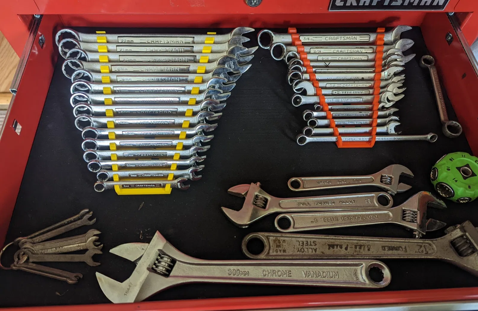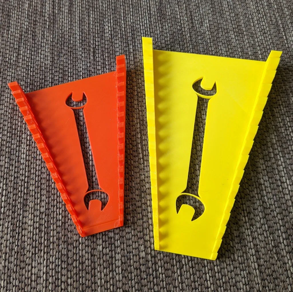 Tôi đã làm những cái này cho bộ cờ lê 15 cái của tôi, kích thước từ 8-22 mm. Ban đầu tôi làm cái nhỏ trước, nhưng nó quá chật đối với bộ cờ lê lớn. Tuy nhiên, nó vẫn ra tuyệt vời và hoạt động hoàn hảo cho một số cờ lê ngẫu nhiên còn thừa của tôi.