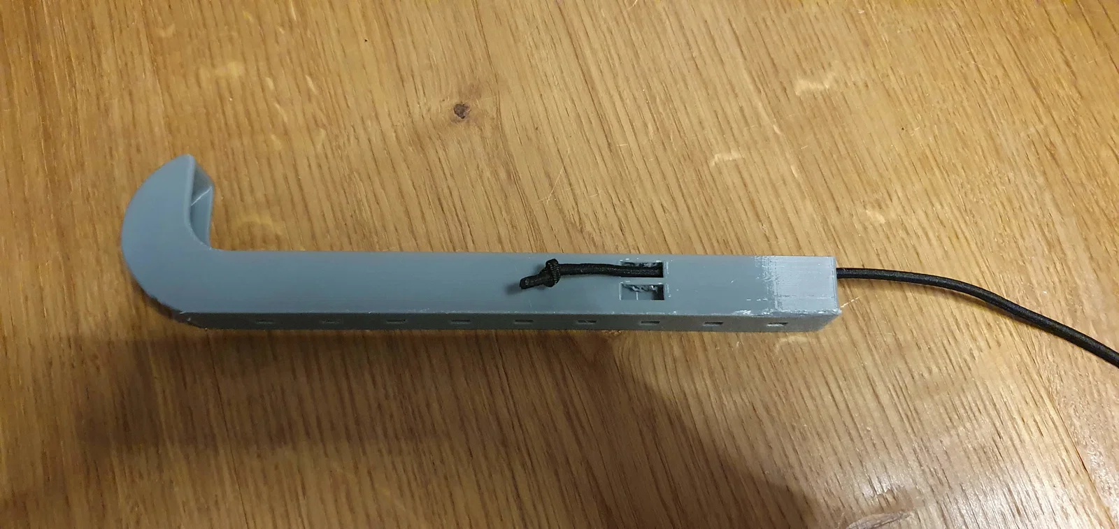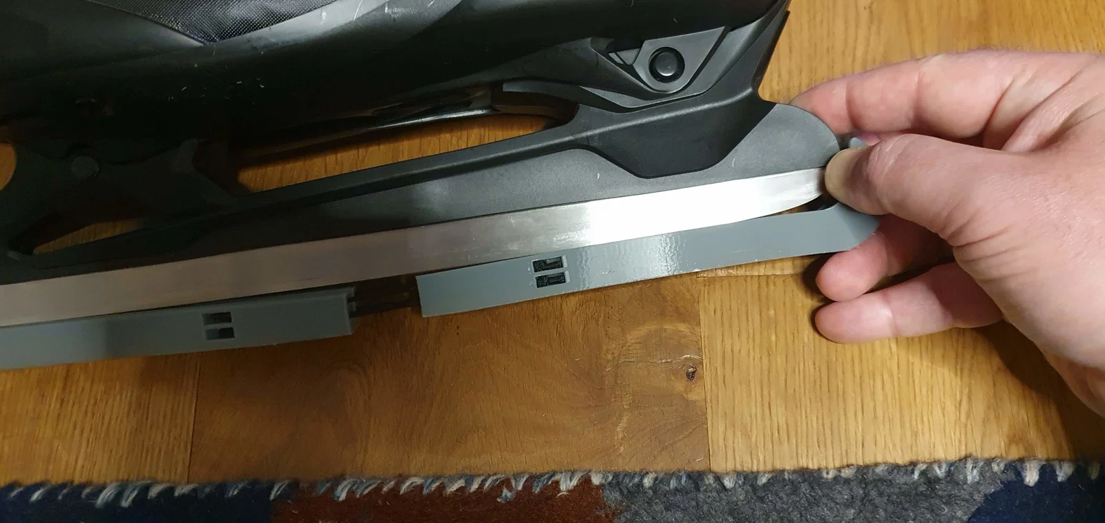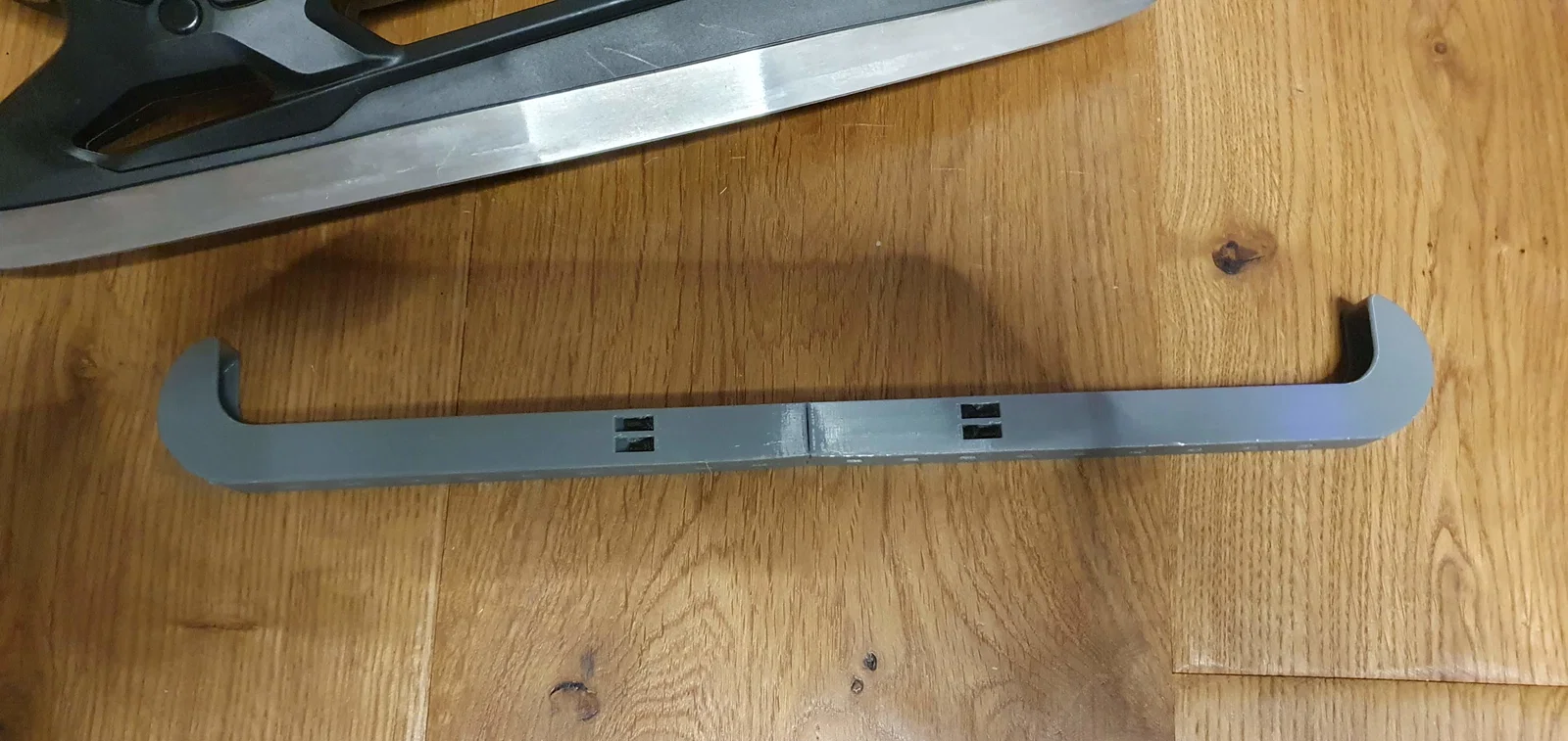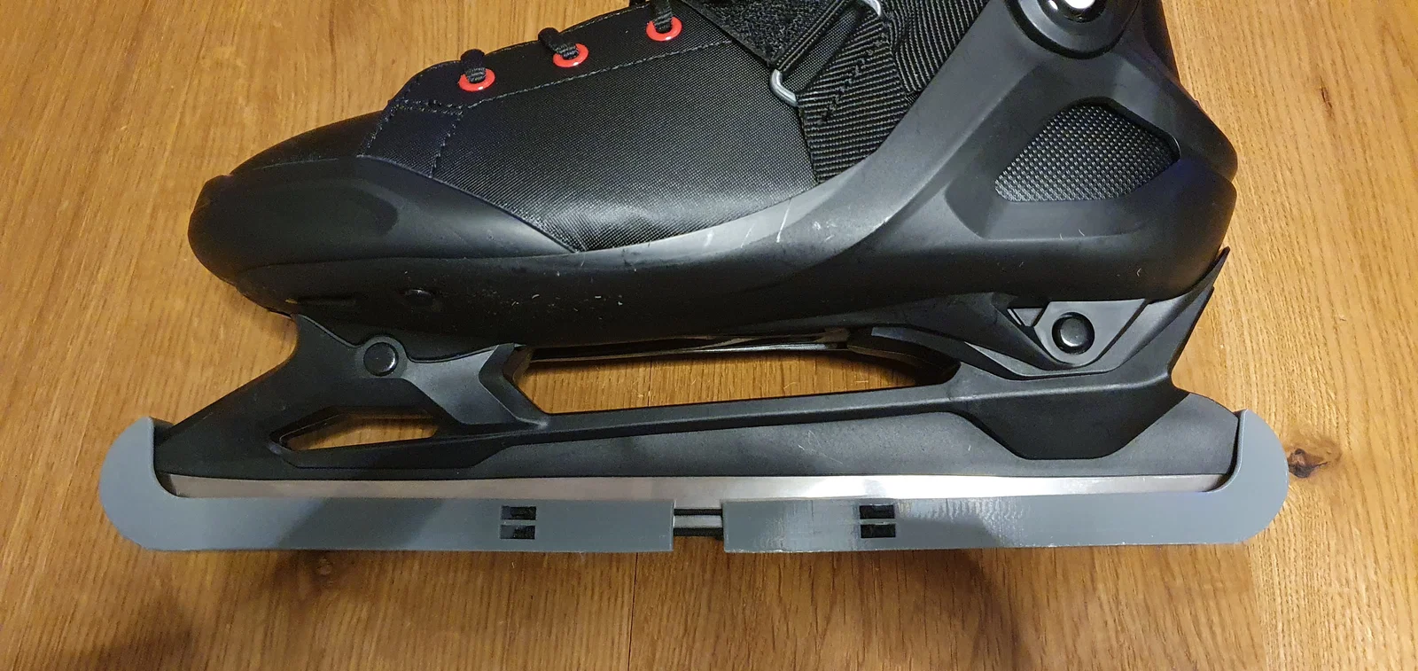 Đây là một ốp lưỡi giày trượt băng. Thiết kế đối xứng, cần 4 bộ phận in để tạo thành một đôi. Để tạo thành một ốp, 2 mảnh được gắn với nhau bằng dây chun, như trong hình. Tôi khuyên dùng dây chun 2,5mm. Tôi đã in bằng TPU, nhưng vật liệu cứng hơn cũng có thể dùng được. Không cần hỗ trợ. Độ điền đầy 60% sẽ đủ chắc chắn (tôi đoán vậy, chưa thử nghiệm đủ lâu). Nó phải chịu được trọng lượng của bạn trên lưỡi dao, vì vậy nó phải chắc chắn. Nếu lưỡi dao của bạn ngắn hơn, chỉ cần cắt 1 cm ở phần mỏng hơn.