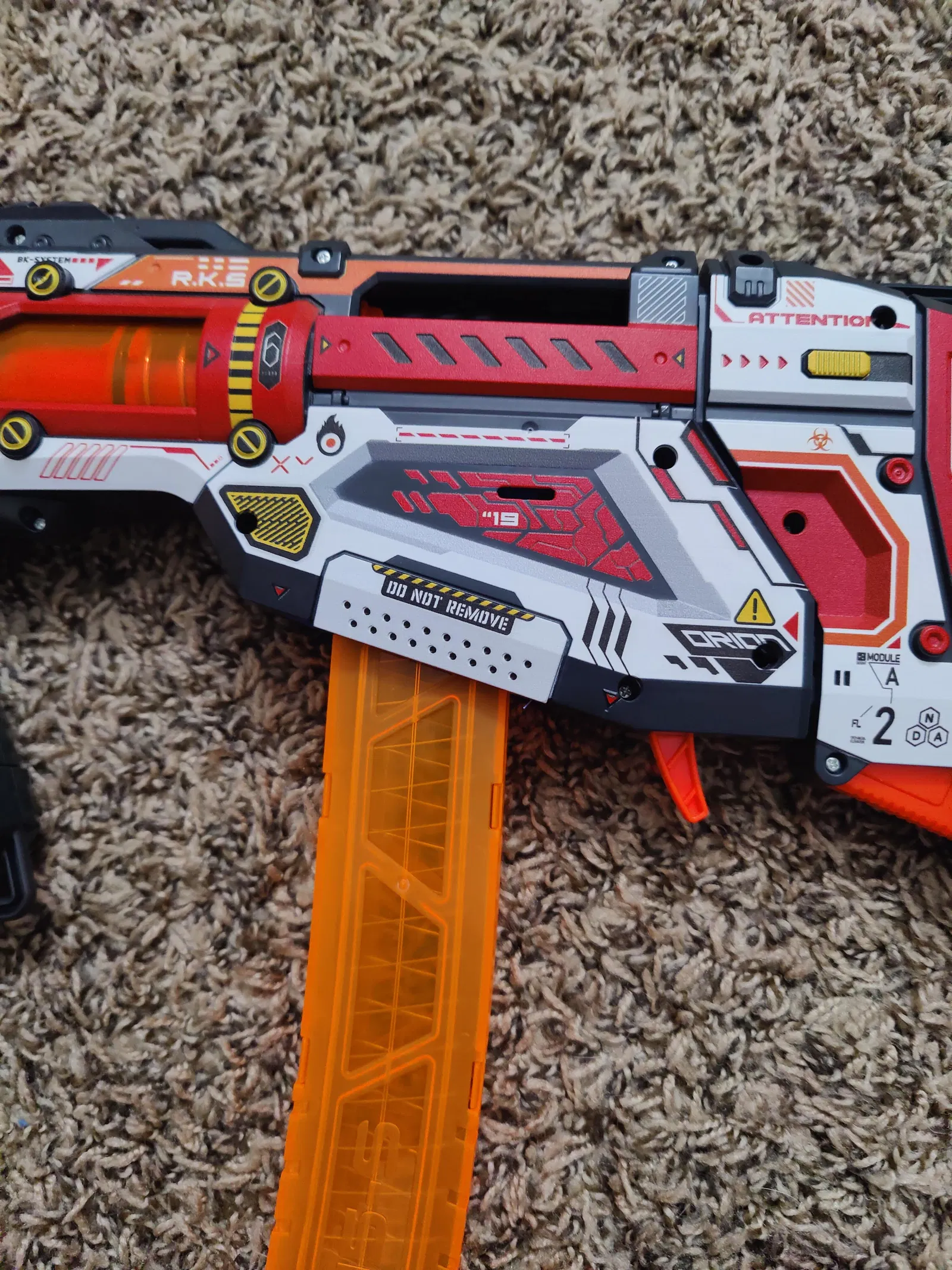 Cả hai phiên bản này nên được in sao cho "Bên ngoài" của hộp băng đạn tiếp xúc với khay in. Điều này sẽ yêu cầu vật liệu chống đỡ, việc loại bỏ có thể khó khăn, nhưng bên trong hộp băng đạn, cũng như các khe bên trong sẽ mịn và các bộ phận tiếp xúc với khay hoặc được chống đỡ sẽ không nhìn thấy được. Đó là một sự đánh đổi mà tôi sẵn sàng chấp nhận và tôi hài lòng với kết quả. Nhìn chung, đây là một trải nghiệm tốt hơn cho tôi. Đối với phần cắt chốt giữ băng đạn. Xem ảnh bộ phận màu cam và cắt theo đường màu đen.