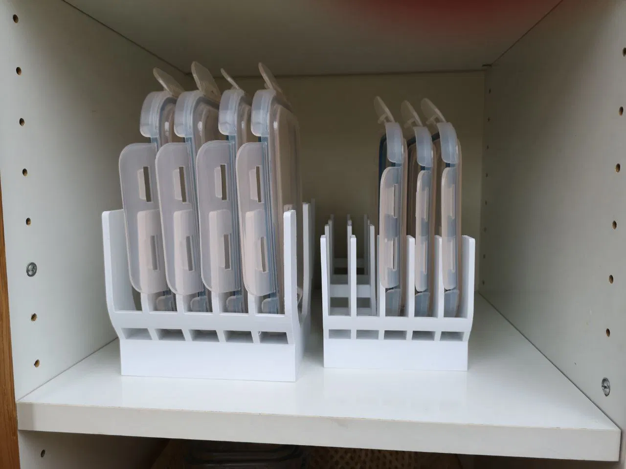 Giá đỡ nắp hộp Tupperware, giúp sắp xếp nhà bếp gọn gàng. Có cả phiên bản lớn và nhỏ, phù hợp với nhiều loại nắp. Có thể in không cần hỗ trợ nếu máy in có khả năng bridging tốt.
