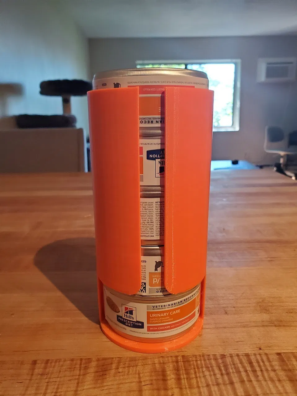 Đây là một bộ phân phối nhỏ mà tôi đã thiết kế để đựng thức ăn cho mèo. Tôi đã thiết kế nó xung quanh lon thức ăn cho mèo của Hills C/D, nhưng tôi hình dung nó cũng có thể chứa hầu hết các loại lon thức ăn ướt có đường kính 3,3 inch. Các lon phải được xếp chồng theo các hướng đối diện nhau để có thể lấy chúng ra.