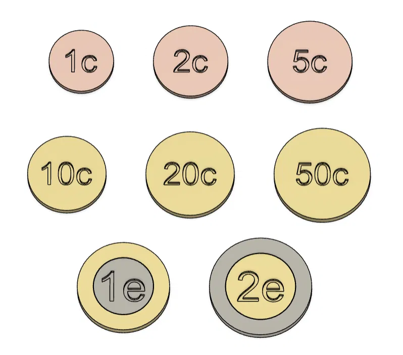 Mô hình các đồng Euro với kích thước chính xác theo mô tả của Hội tiền tệ Pháp. Lưu ý: Đúc tiền thật là bất hợp pháp, nên đây chỉ là mô hình tiền giả. Đã bổ sung file cho in đa màu.