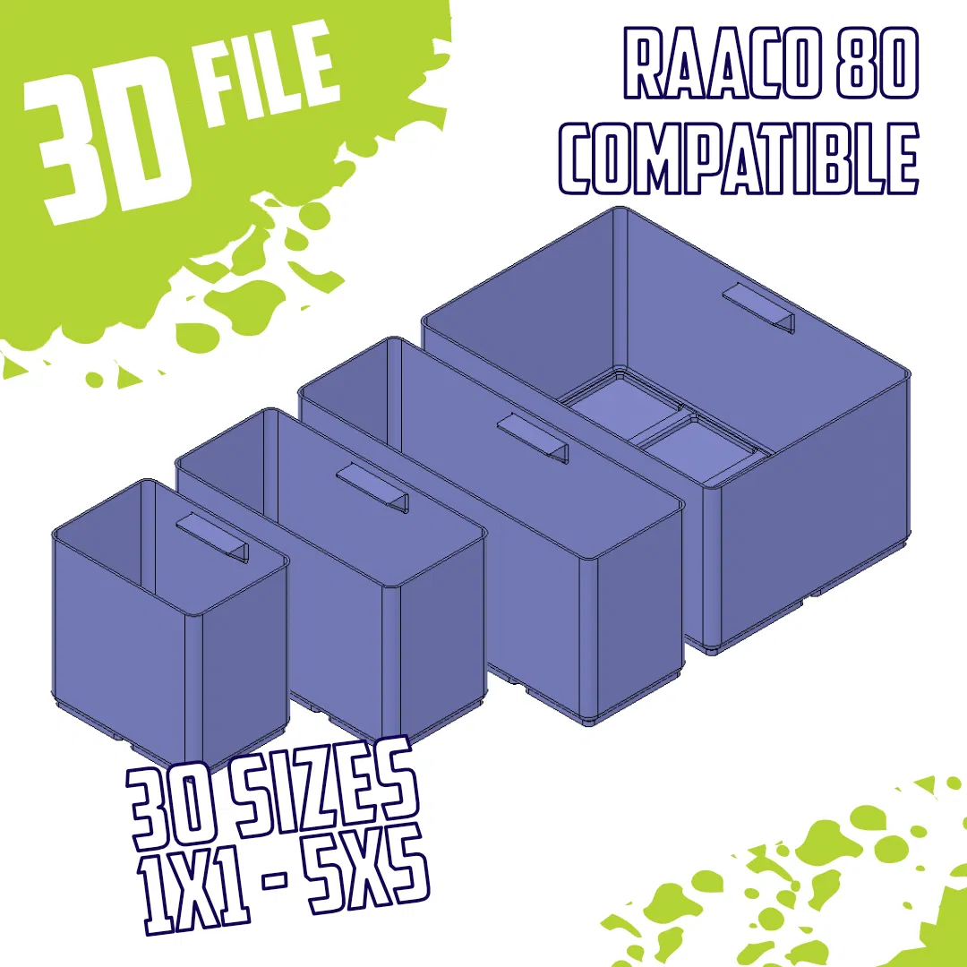 Bộ sưu tập khổng lồ các hộp in 3D tương thích với hệ thống Raaco 55 và 80. Bao gồm lưới, nắp phẳng, giá đỡ dụng cụ và mô hình Fusion360 tham số. Tối ưu hóa không gian lưu trữ xưởng của bạn với các hộp có thể xếp chồng và tùy chỉnh kích thước.