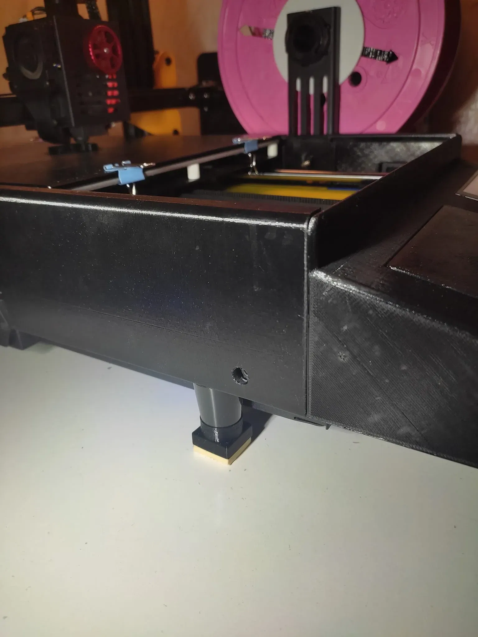 Một miếng đệm siêu mềm có thể được làm từ một cục tẩy cao su đơn giản dưới chân của máy in "Kywoo Tycoon Slim". Bằng cách này, chúng ta có thể giảm đáng kể sự truyền tải của các rung động có hại đến bàn làm việc. Điều này cũng giảm thiểu tiếng ồn phát ra từ máy in.