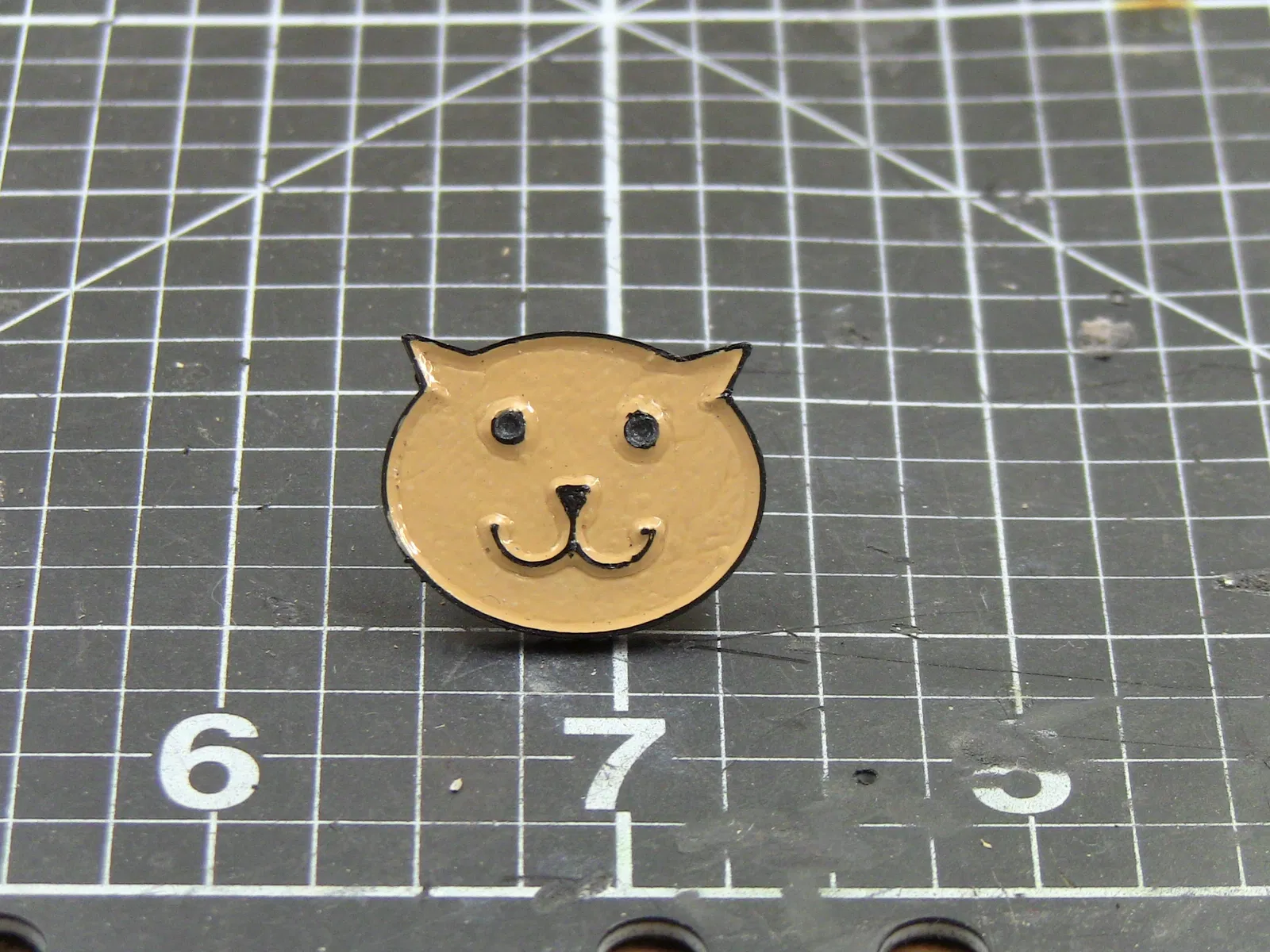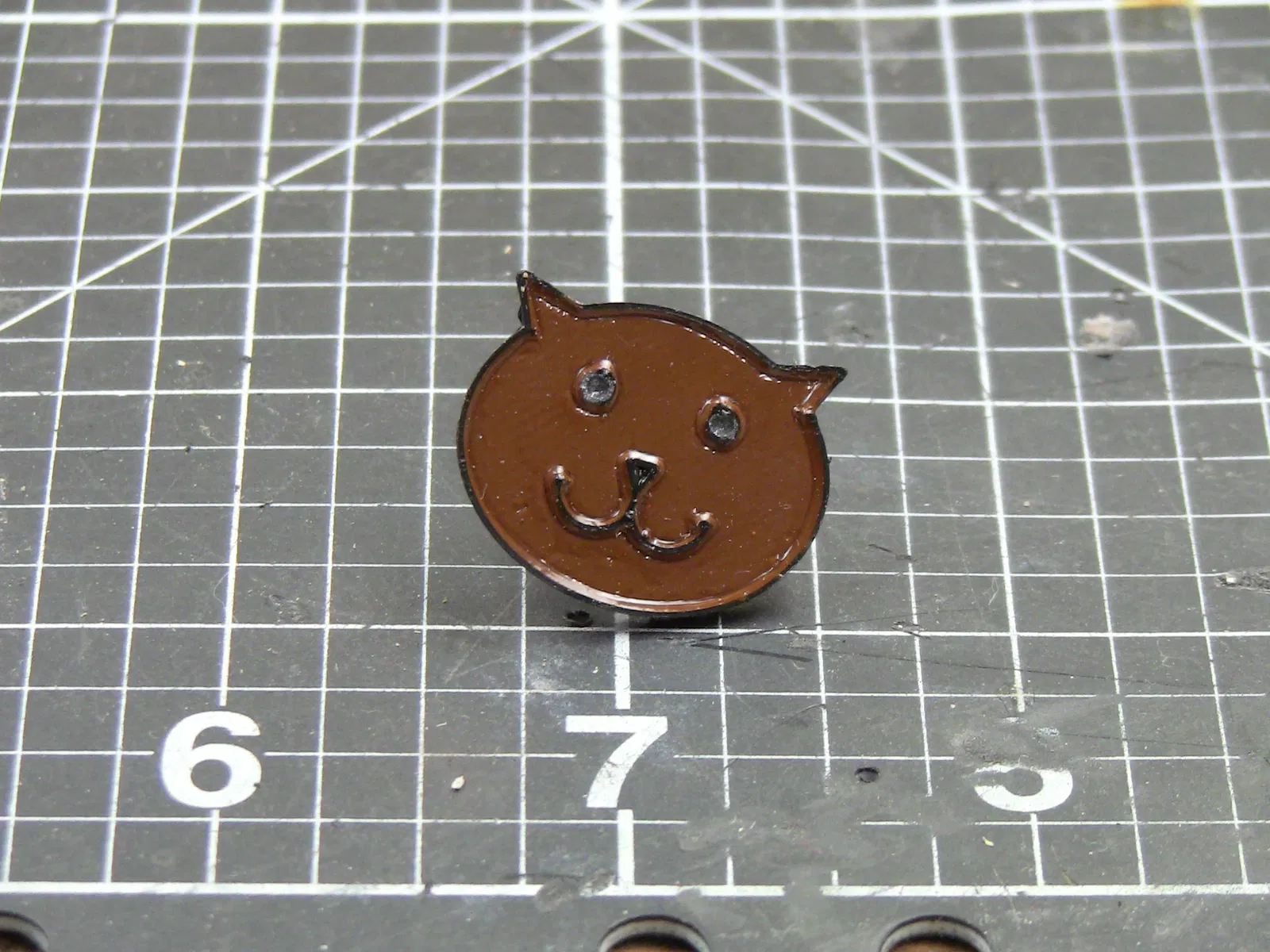 Mô hình 3D của chiếc ghim cài đầu mèo men. Hướng dẫn in ABS với chiều cao lớp 0.1mm và độ đặc 100%. Mô tả cách sơn và hoàn thiện mô hình bằng acrylic và keo CA để gắn mặt sau của ghim.