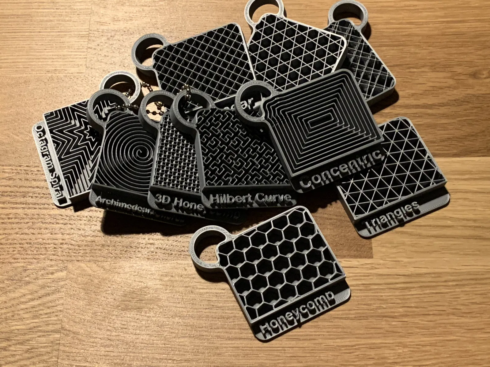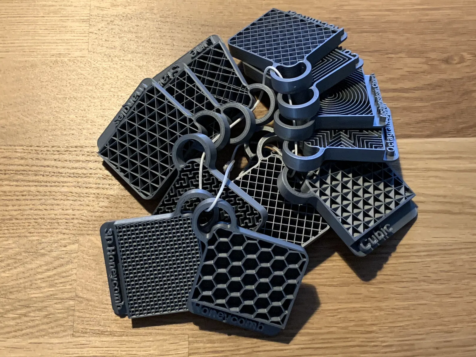 Bộ sưu tập gồm 13 mẫu ruột in (infill) được đặt tên và 1 mẫu trống. Rất hữu ích để nhanh chóng xem xét 13 loại ruột in khác nhau có sẵn trong PrusaSlicer. Lý tưởng để kiểm tra các cài đặt ruột in trên các vật liệu như PLA.