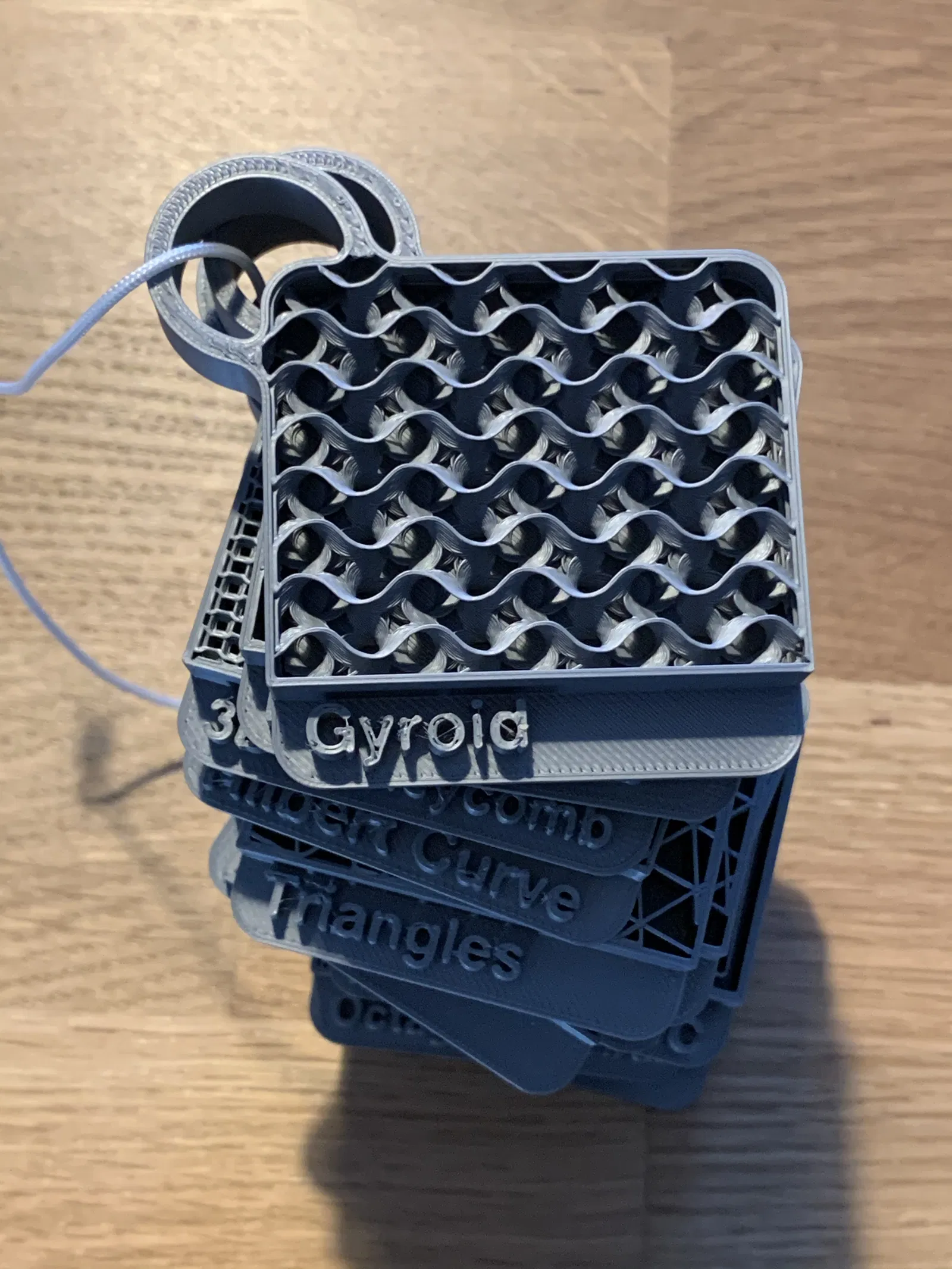 13 mẫu ruột in được đặt tên và 1 mẫu trống. Tuyệt vời để tham khảo nhanh 13 loại ruột in có sẵn trong PrusaSlicer. Một mẫu tốn khoảng 40 phút (file STL chỉ dành cho Gyroid) #### Phiên bản 2 đã có mặt: #### ### Hướng dẫn in Chất lượng: 0.2 Chất liệu: PLA Ruột in (Infill): 10% / 20% (đặt cho từng đối tượng) Mở file 3mf trong PrusaSlicer và di chuyển các mẫu bạn muốn in lên bàn in. Mỗi mẫu có bộ điều chỉnh riêng để loại bỏ lớp trên cùng của mẫu. Khi kéo mẫu bạn muốn cắt lát lên bàn in, hãy đảm bảo bộ điều chỉnh của nó đi kèm theo.