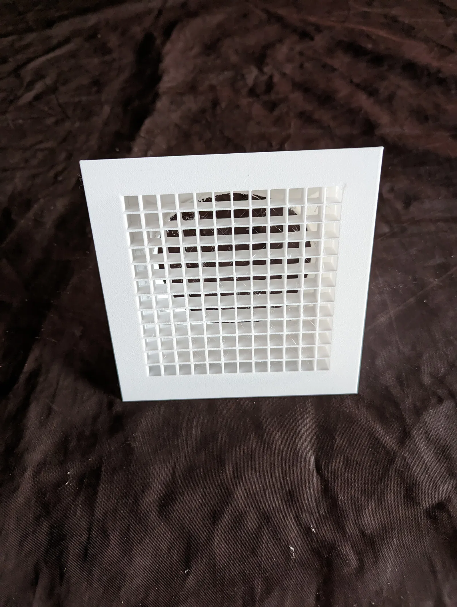 Tấm che cửa gió cho ống PVC thành mỏng 4 inch hoặc ống kim loại tấm. Kích thước vuông 157mm, yêu cầu lỗ tường vuông 121mm. Gắn bằng keo 3M Command Strips hoặc gắn trực tiếp vào ống. In một mảnh, không cần hỗ trợ.