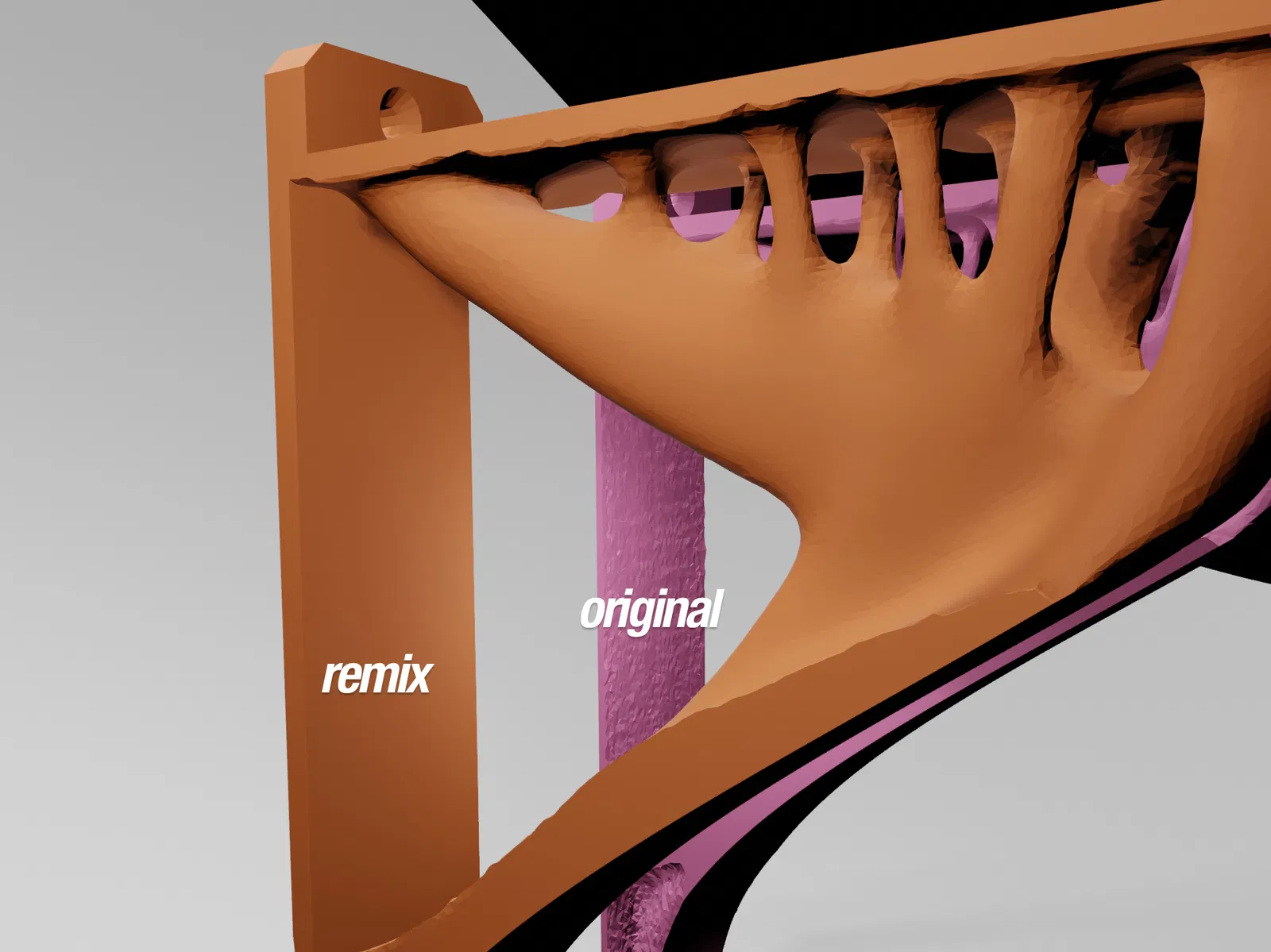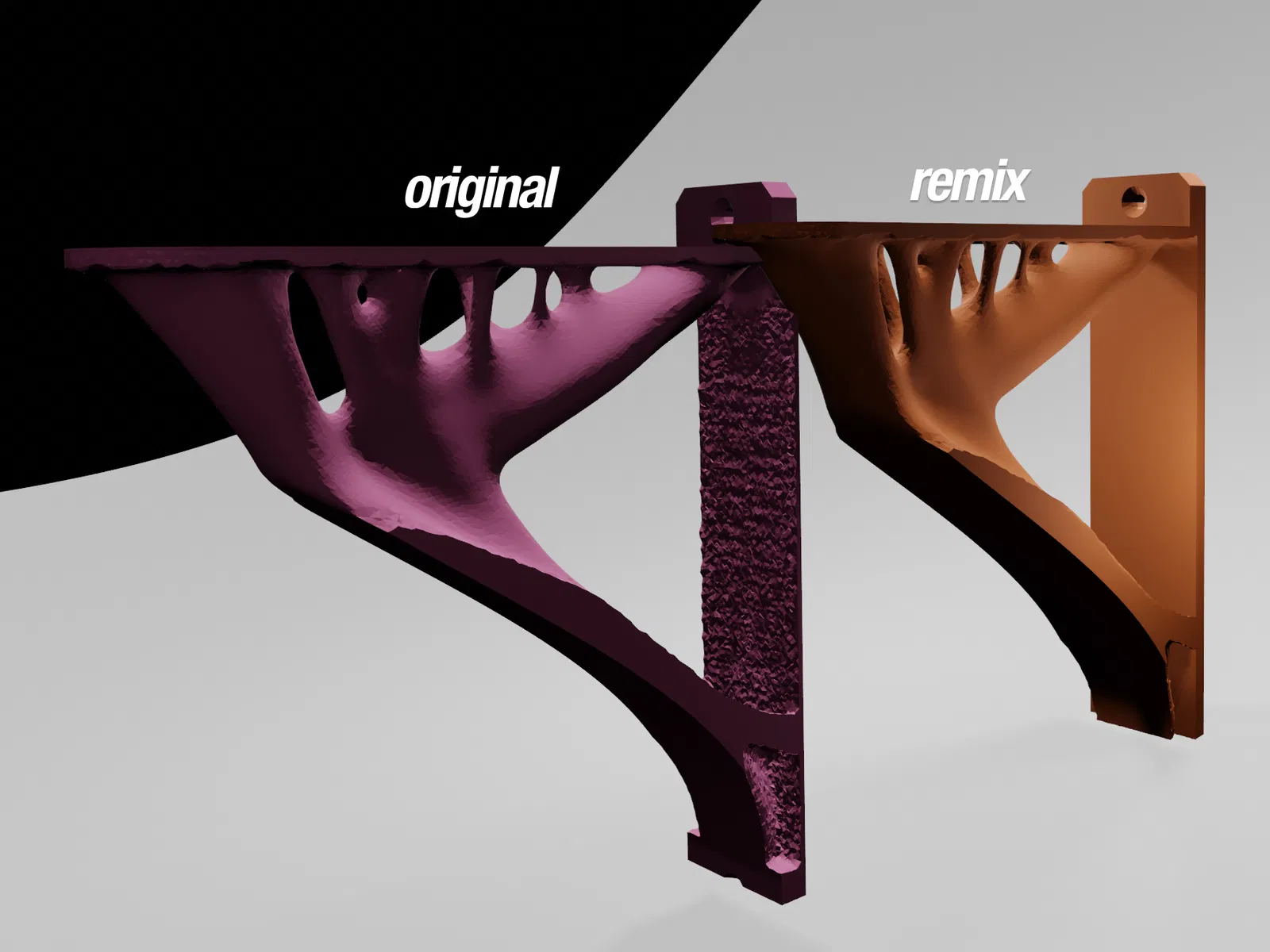 Tôi thích kiểu dáng của những chiếc kệ này và đã cải tiến chúng. Mặt sau của giá đỡ kệ ban đầu mỏng và không đều, vì vậy tôi đã làm cho nó phẳng và dày hơn. Toàn bộ mô hình cũng được làm mịn. Có thể in không cần hỗ trợ và với vòi phun 0,6 mm để tăng độ chắc chắn.