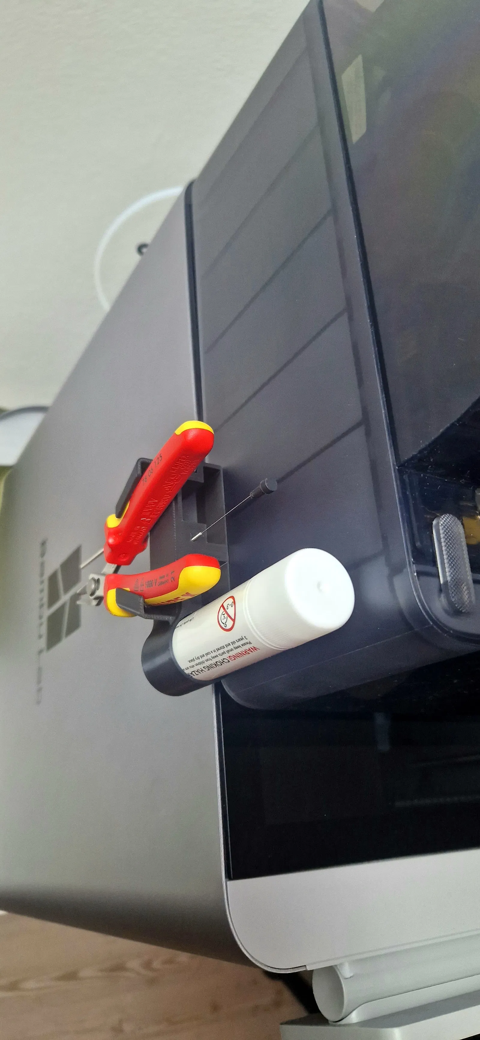 Kệ đựng đồ AMS cơ bản (Gắn Bên) - Hàng Gốc. Kệ này đựng các dụng cụ quan trọng nhất cho AMS của bạn, gắn vào dễ dàng và in được trong 1 lần. Bao gồm keo Bambu, dụng cụ ngắt kết nối AMS, dao cạo, cờ lê, dụng cụ vệ sinh đầu phun và kìm.