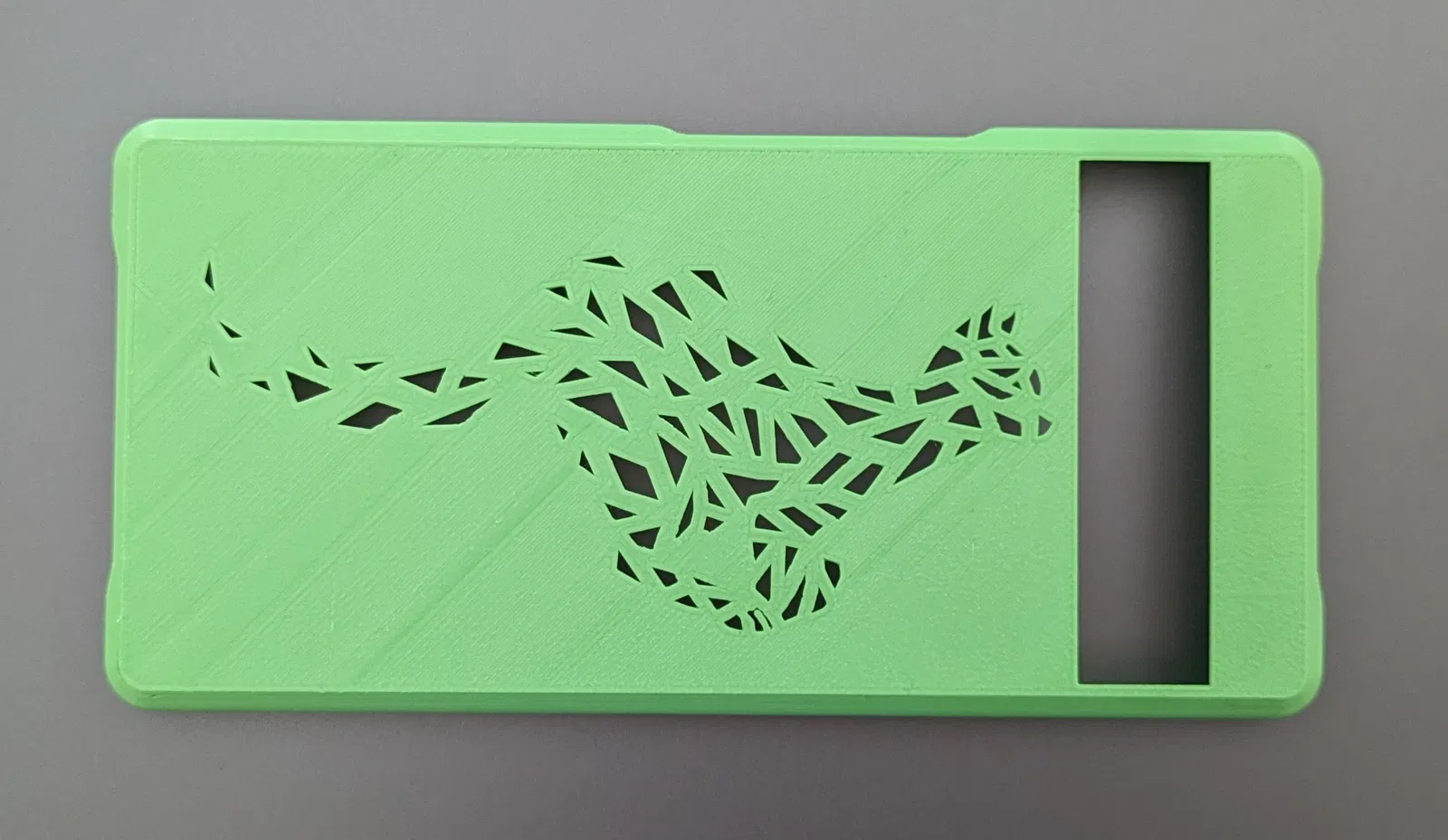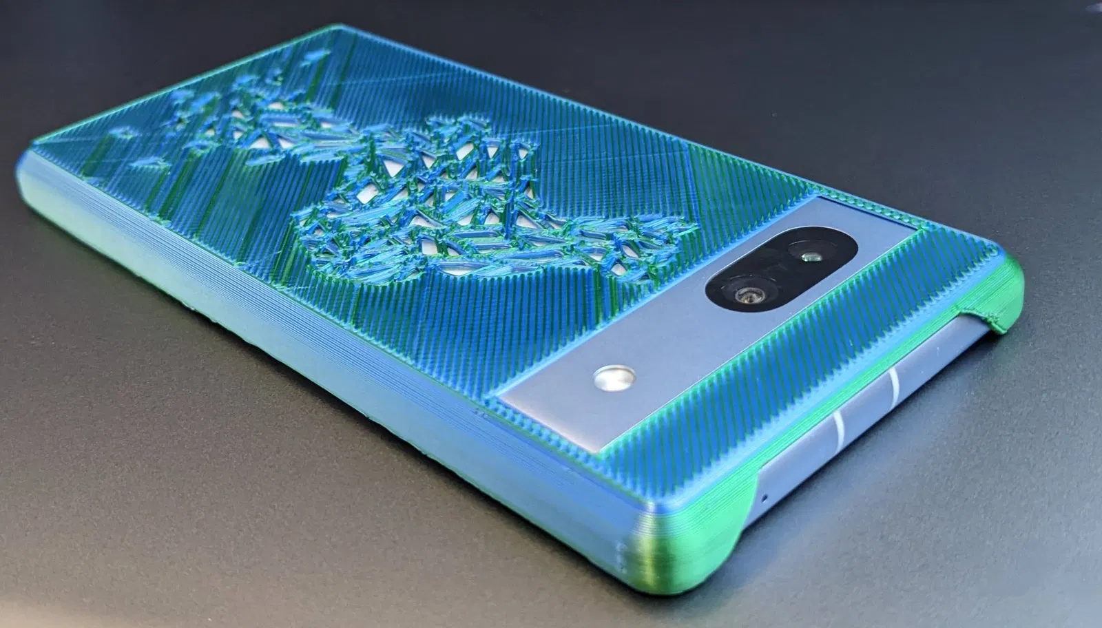 Ốp lưng cho Google Pixel 7a. Phiên bản này có họa tiết nghệ thuật mèo độc đáo, được in bằng PLA lụa với chiều cao lớp 0,2mm. Mô hình có các bo góc lớn để tăng độ bền và có thể in mà không cần hỗ trợ.