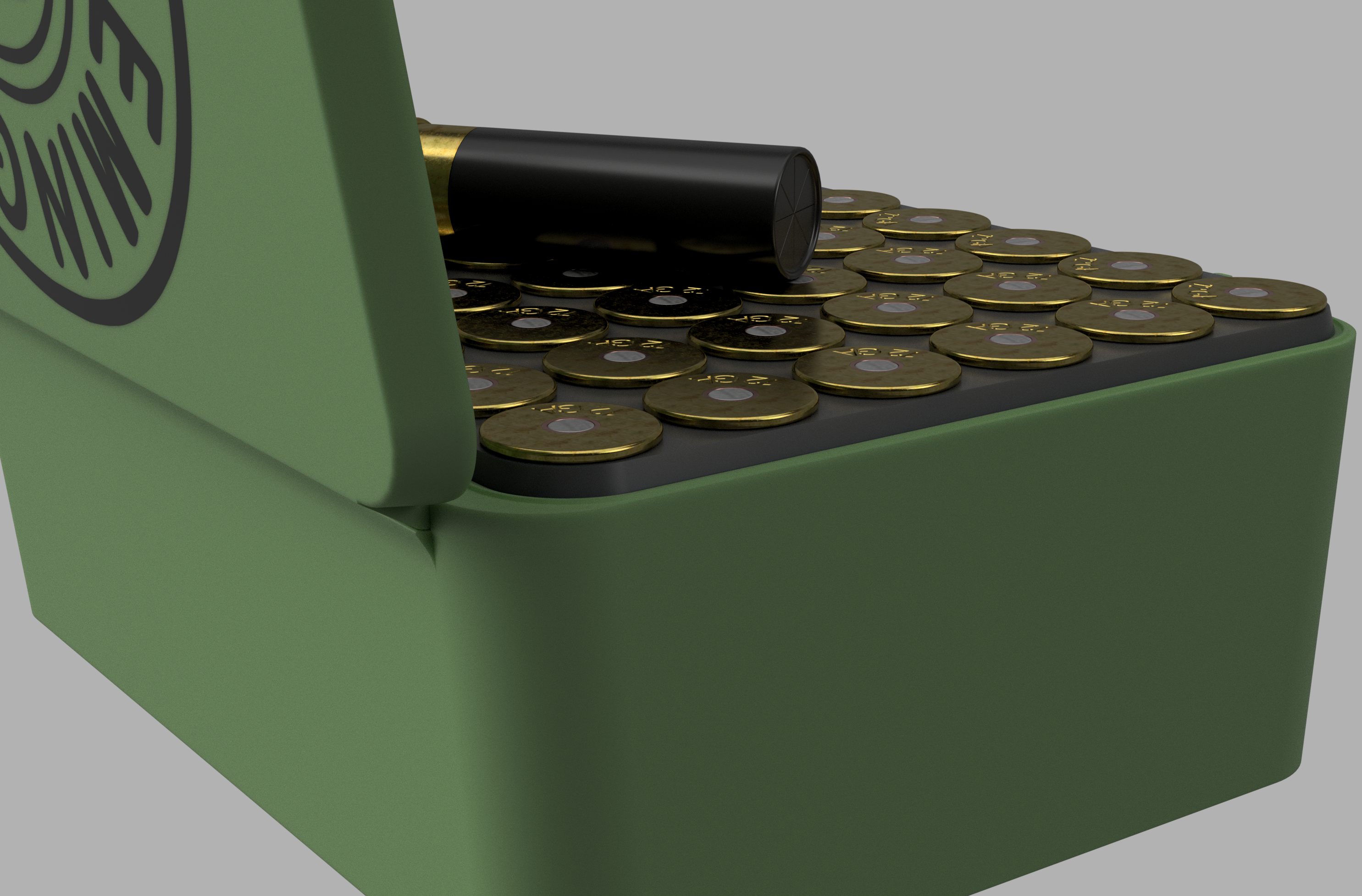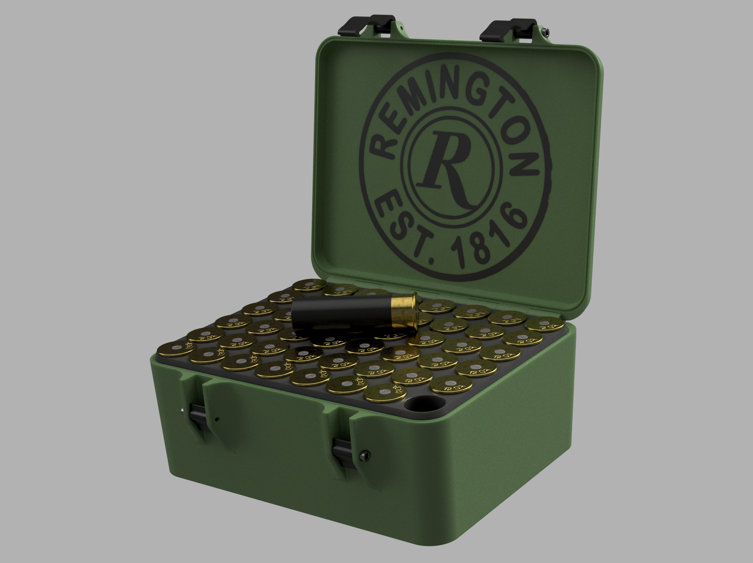 Hộp đựng đạn 12 GA Remington được thiết kế với khoảng cách 48 viên/20,90x70mm và tổng chiều cao 73,35mm. Kích thước hộp 199,30x165,47x77,85mm, sử dụng vít M3x20mm và chốt bản lề 1,6mm. Khuyến cáo in bằng PLA, PETG hoặc ABS với nhiều lớp vỏ do trọng lượng đạn.