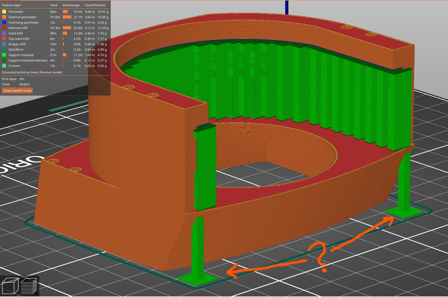 In tất cả các bộ phận theo hướng của các tệp STL. Sử dụng hỗ trợ cho các gờ portafilter trên giá đỡ. Tôi đã bao gồm một tệp 3mf với các hỗ trợ đã được tô màu cần thiết. Bất kỳ sự kết hợp nào giữa bộ phận thực thi hoặc bộ chặn mà tôi đã thử đều không loại bỏ được hai cột nhỏ (xem hình). Nếu ai đó có thể cho tôi biết các cài đặt tôi cần thay đổi, tôi sẽ rất vui lòng sửa nó.