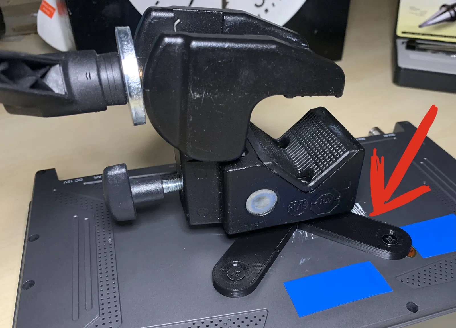 Đây là một bộ chuyển đổi tấm adapter mà tôi đã thiết kế để gắn một màn hình mini có lỗ Vesa 75mm ở mặt sau vào kẹp Manfrotto có vít tripod.