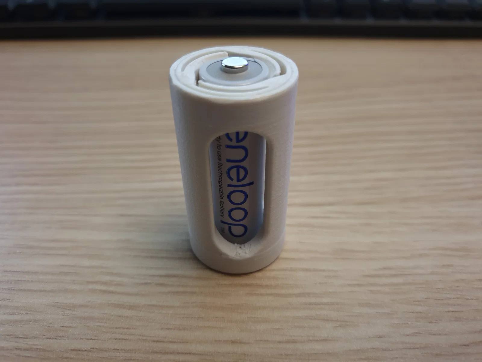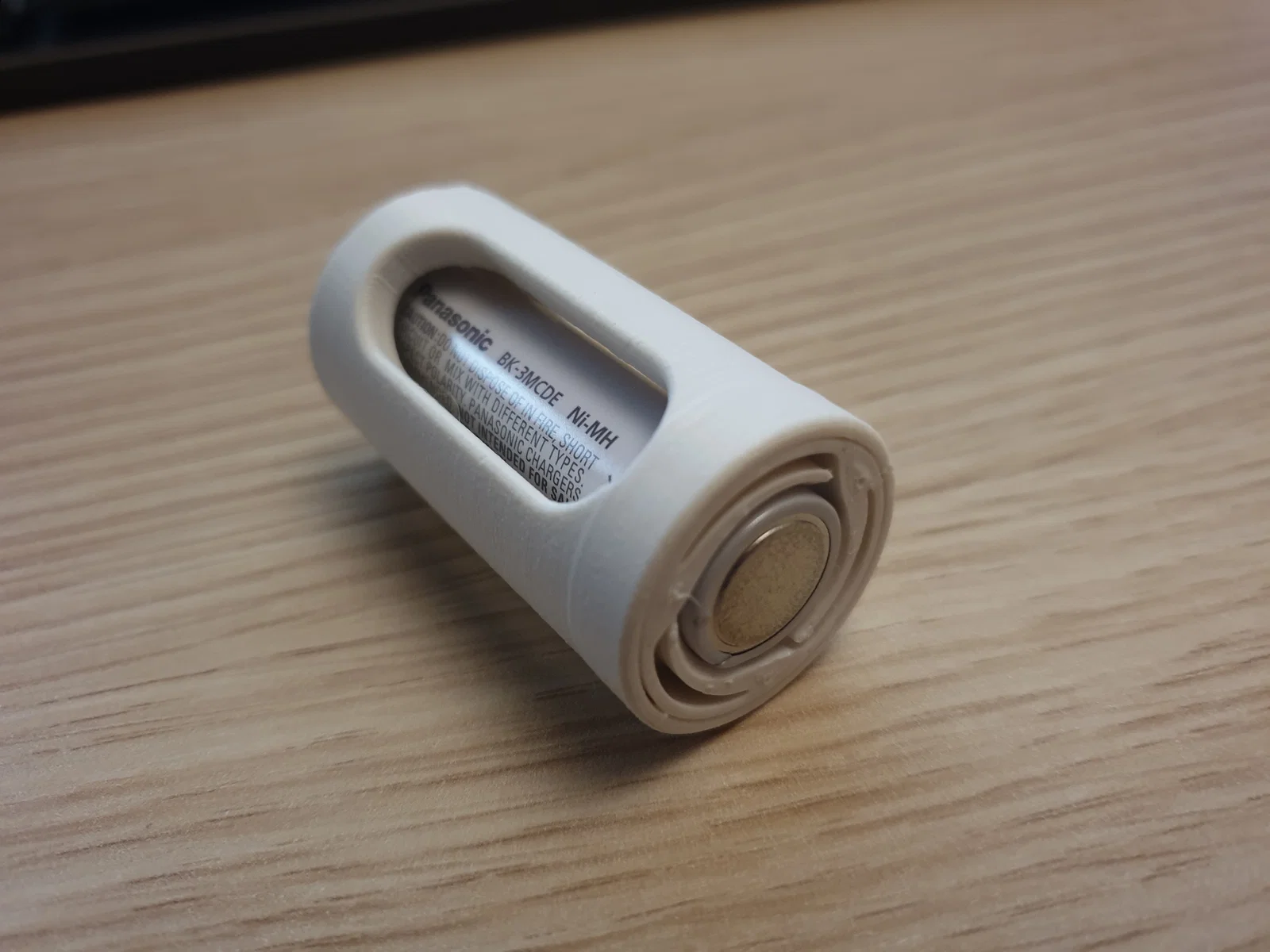 Bộ chuyển đổi cho phép sử dụng pin cỡ AA thay cho pin cỡ C, rất hữu ích cho các thiết bị như Roomba lighthouse. Thiết kế yêu cầu in với vật liệu ASA, có hỗ trợ và brim, và sử dụng keo siêu dính để lắp ráp.
