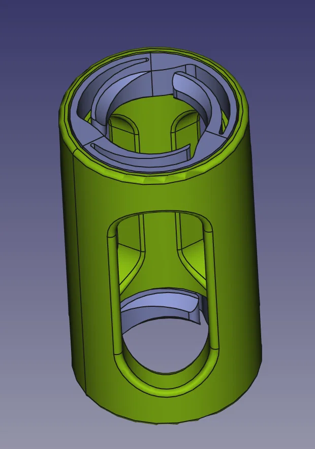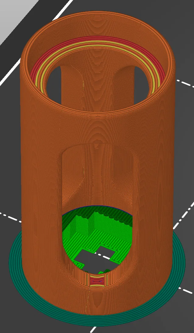 Khi in thân, cần có các bộ phận hỗ trợ trong phần lõm nơi lò xo được lắp (hình ảnh cid:image_1). Ngoài ra, việc sử dụng brim là bắt buộc để giữ cho bộ phận in bám chắc vào bề mặt.