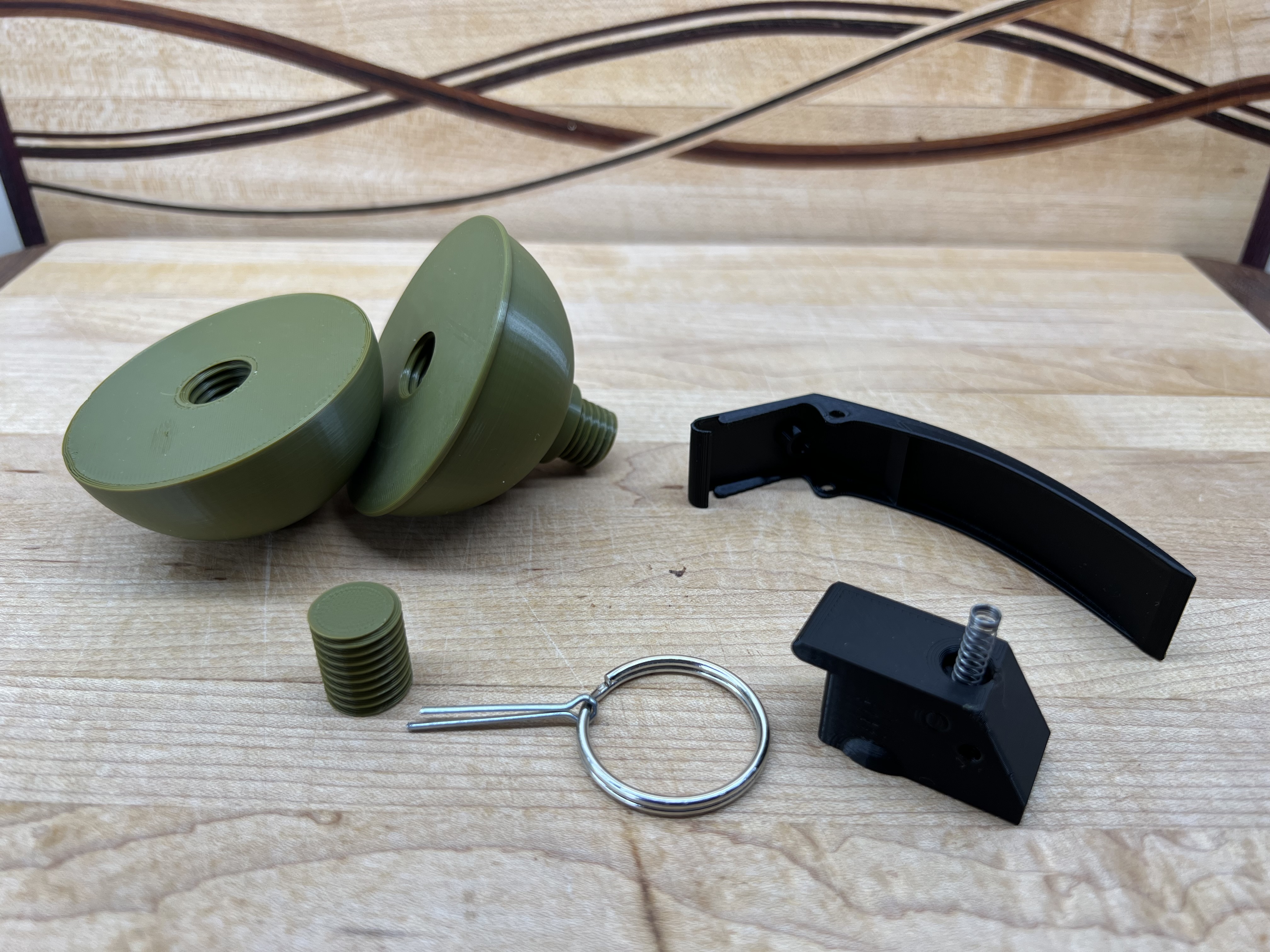 Tìm hoài không thấy cái lựu đạn nào ưng ý, nên mình tự thiết kế một cái riêng. Mục tiêu là trông ngầu, không cần keo dán, có lò xo đẩy cần an toàn, chốt an toàn thật và dễ in. Cần lò xo bút bi, chốt an toàn và vòng chìa khóa. Nhớ đọc kỹ hướng dẫn lắp ráp nha.