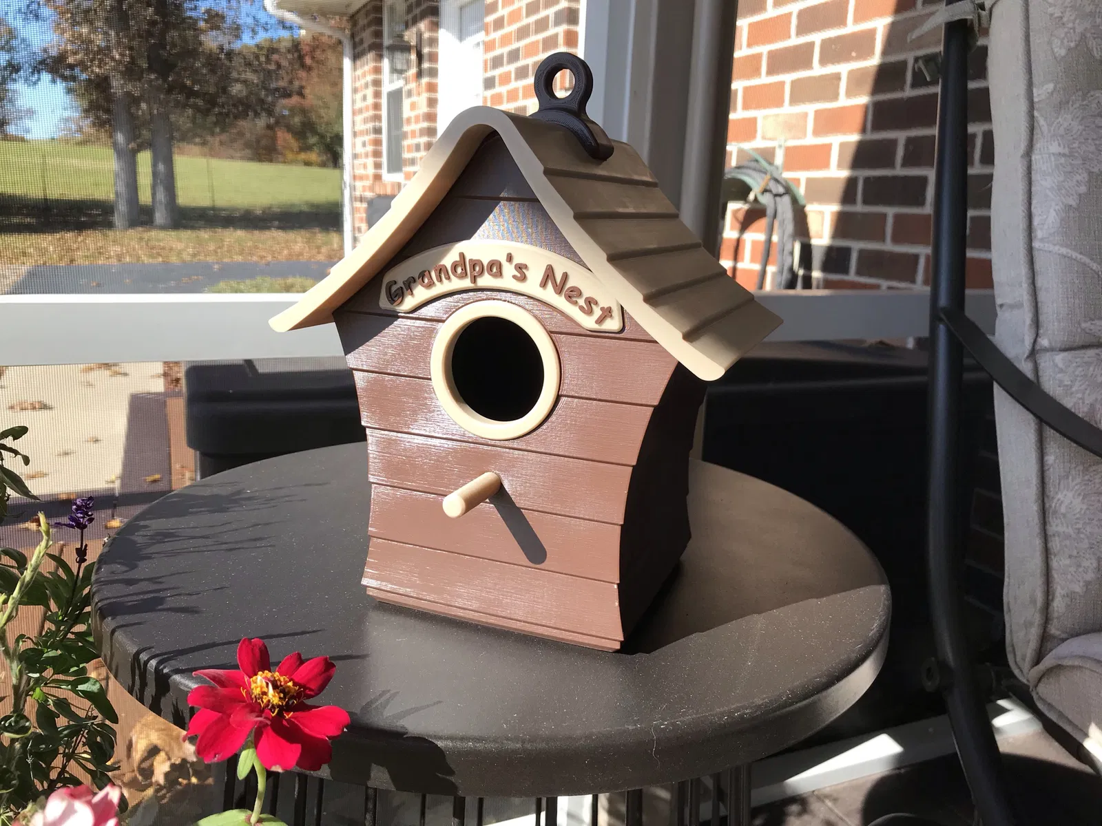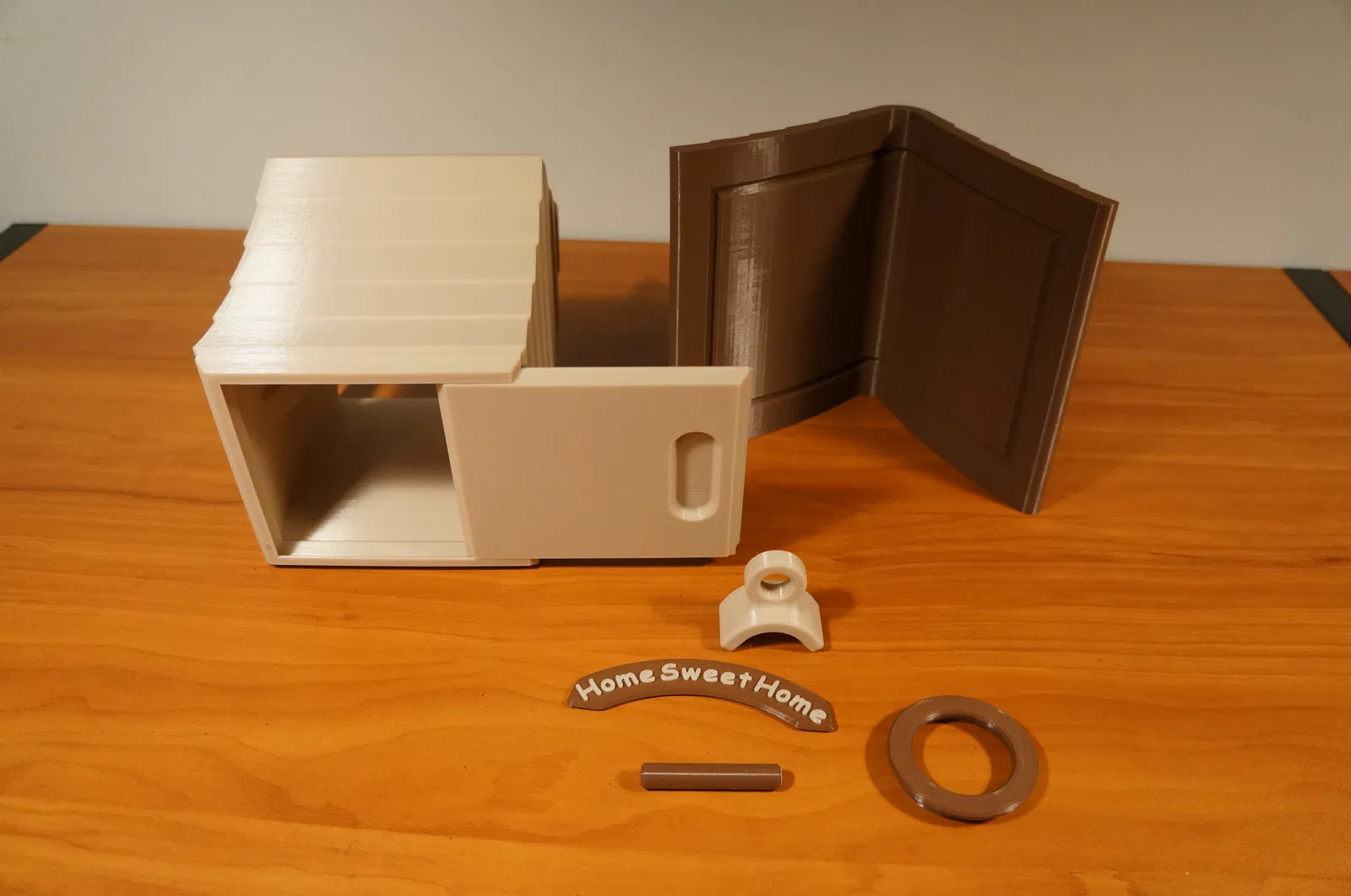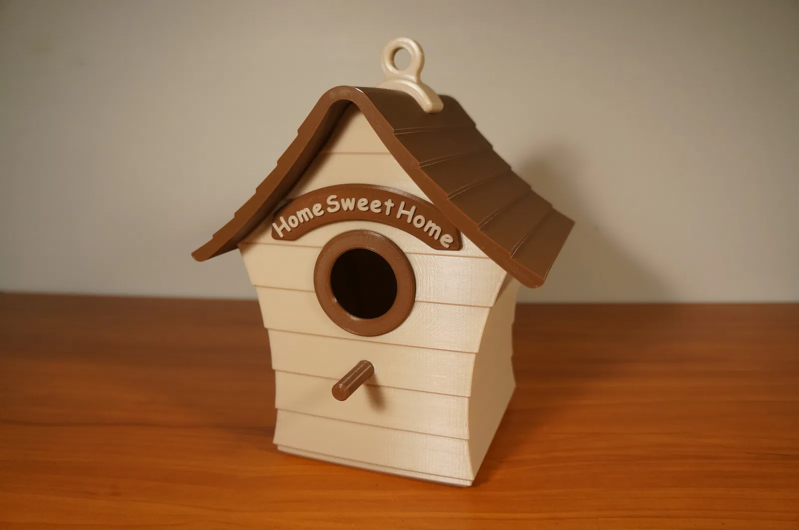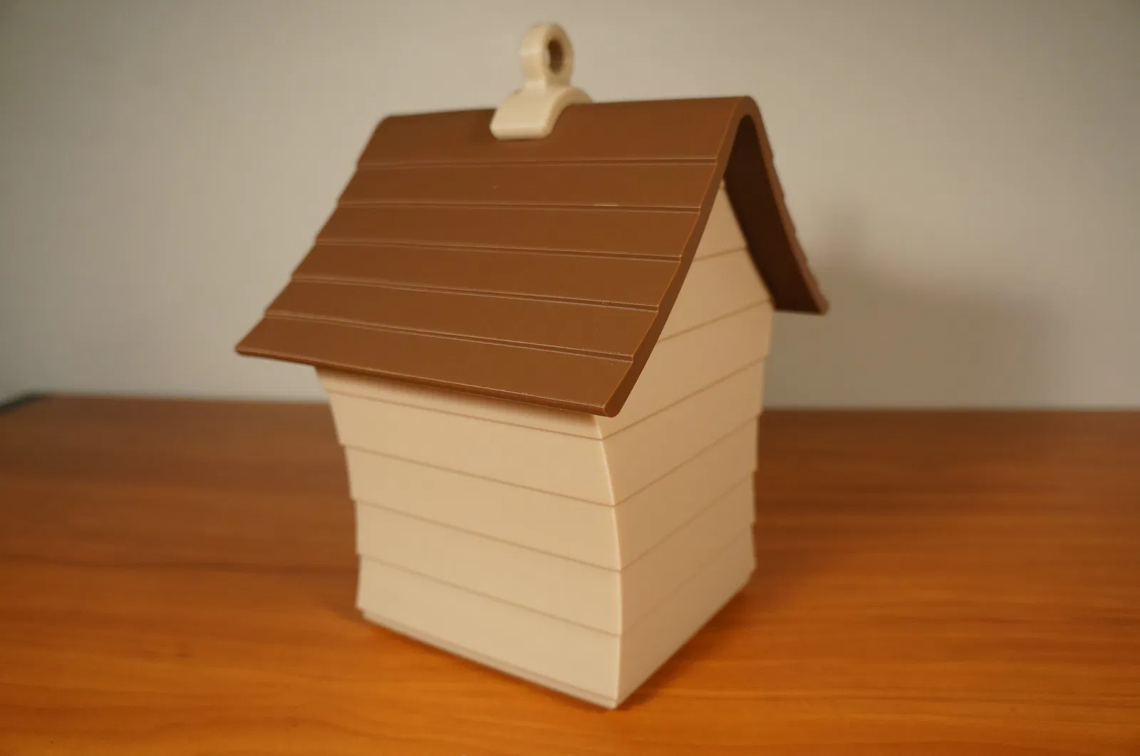 Đây là một ngôi nhà chim ghép lại với nhau gồm 7 mảnh. Mỗi khớp dán được xác định rõ ràng bằng một vết lõm hoặc rãnh chữ V (cho khớp mái và thân). Có một đáy trượt ra để dọn tổ cũ.