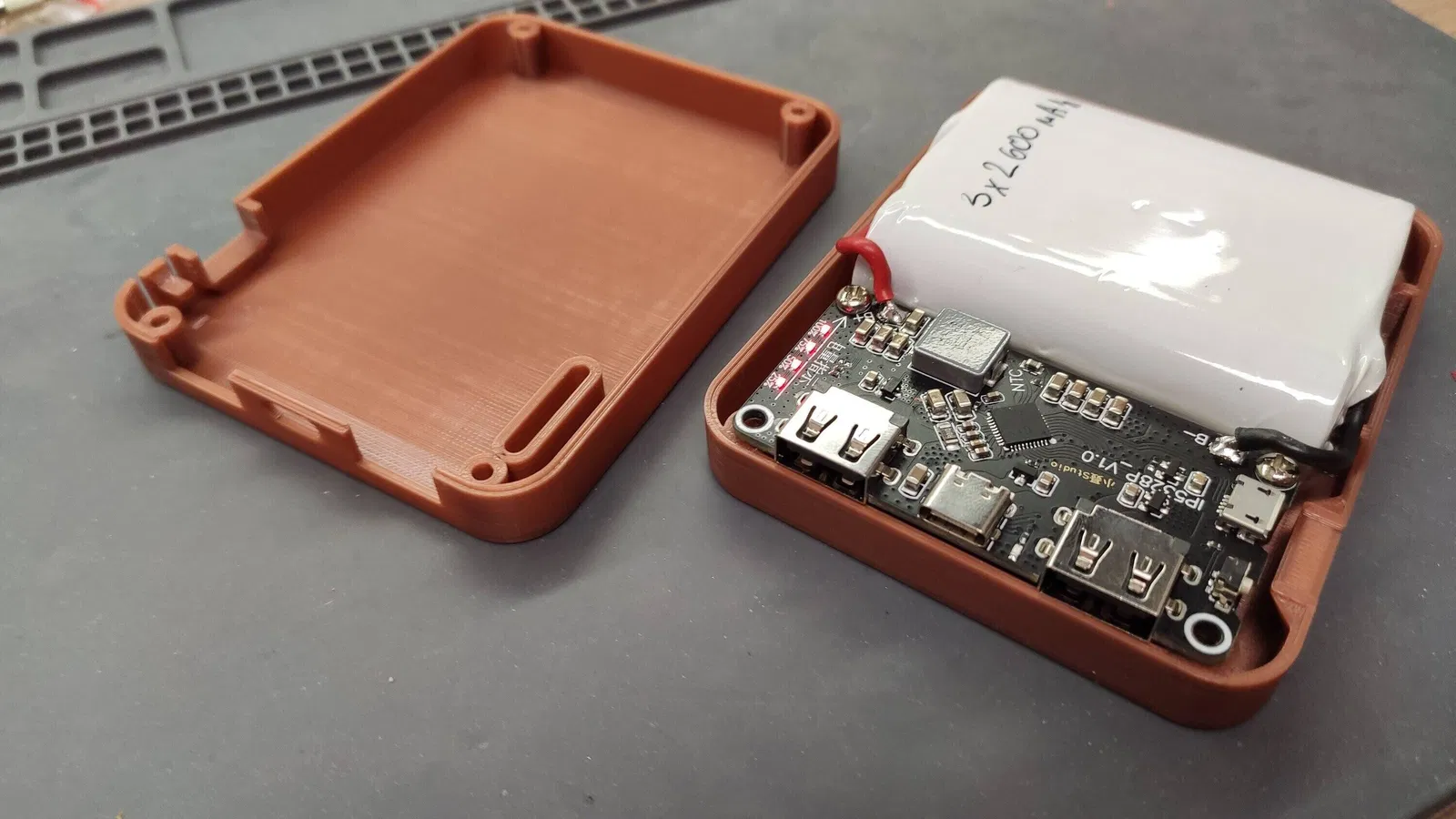 Sạc dự phòng sạc nhanh với chip IP5328P, hỗ trợ nhiều giao thức. Hộp có thể tùy chỉnh cho nhiều pin 18650 mắc song song. Cần 4 vít M3x10 và 2 vít M3x8. Phần hỗ trợ nút bấm cần cắt. In hộp và nắp không cần support. Giá $5 trên Ali Express.