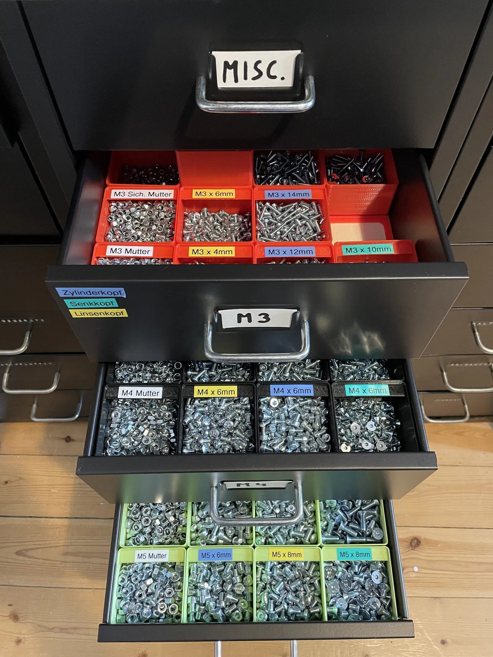 Hộp sắp xếp với nhiều kích cỡ khác nhau cho Tủ IKEA Helmer. Sản phẩm này giúp bạn tối ưu hóa không gian lưu trữ, có thể đặt 48 hộp nhỏ 1x1 vào mỗi ngăn kéo. Hộp có thể xếp chồng và khóa vào nhau, lý tưởng để cất giữ ốc vít và các bộ phận nhỏ.