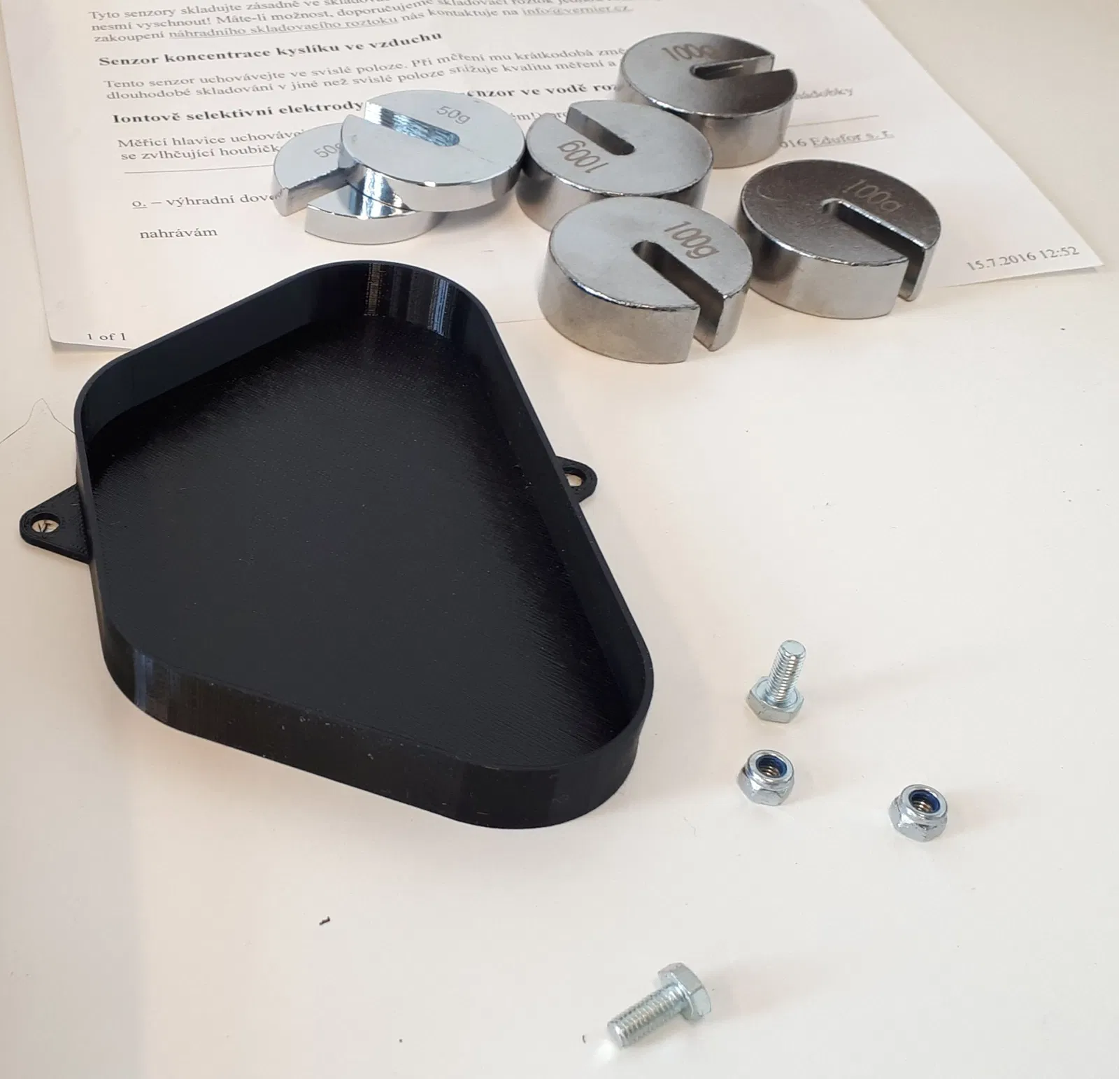 Do trường học, chúng tôi đã mua bộ Vernier - Thiết bị cho nghiên cứu chuyển động quay (GDX-CFA). Để hoàn thiện, nó cần một cách để lưu trữ các trọng lượng không sử dụng. Đế hình tam giác có các lỗ đã khoan sẵn, mà tôi đã sử dụng để gắn một cái khay thấp cho trọng lượng. Ngoài bộ phận in, chỉ cần hai con vít M4x10 và (tốt nhất) đai ốc tự khóa. Được in bằng PETG, tôi khuyên bạn nên sử dụng tấm in có kết cấu hoặc satin.
