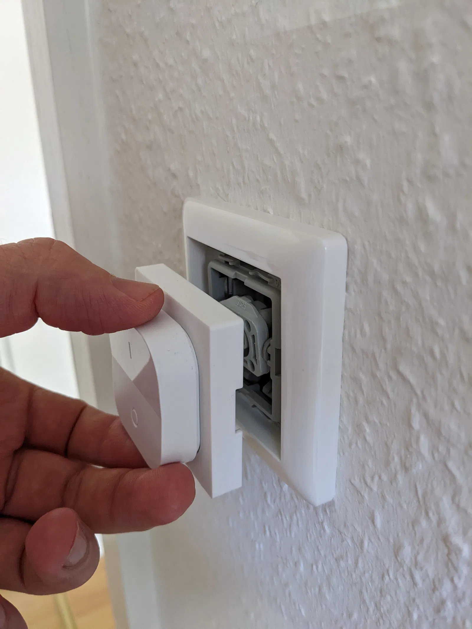 Đơn giản chỉ cần tháo tấm công tắc đèn gốc và giữ cơ chế bật "bật". Bộ chuyển đổi đã in sẽ trượt vào vị trí và không cần cố định thêm.