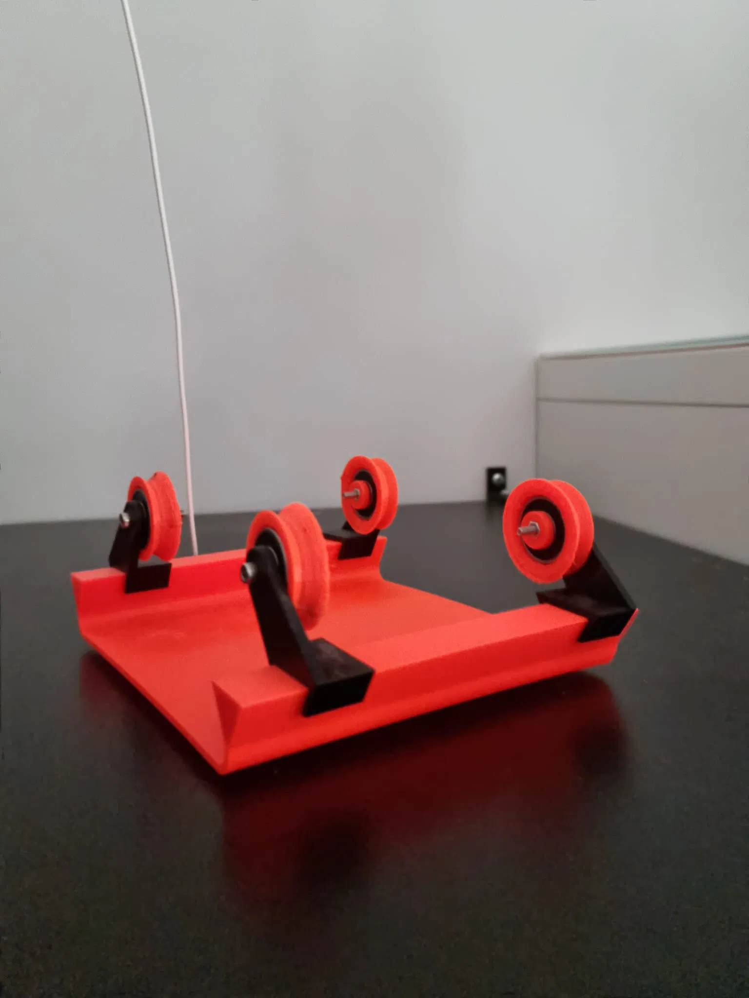 Thật không may là (gần như) mọi nhà sản xuất sợi nhựa đều có kích thước cuộn khác nhau (chiều rộng). Do đó, tôi đã tự thiết kế một giá đỡ cuộn có thể điều chỉnh. Mục tiêu của tôi là gắn nó lên trên thùng máy của mình mà không cần cố định vào đâu cả.