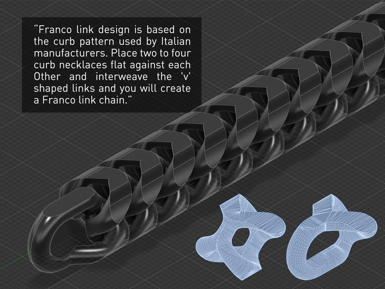 "Thiết kế mắt xích Franco dựa trên họa tiết dây chuyền mà các nhà sản xuất Ý sử dụng. Đặt hai đến bốn dây chuyền phẳng cạnh nhau và lồng các mắt xích hình chữ 'v' vào nhau và bạn sẽ tạo ra một chuỗi mắt xích Franco." - khá đơn giản.