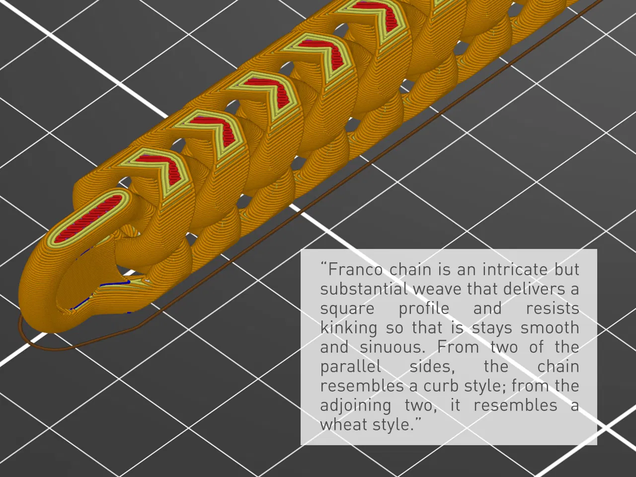 Vì vậy, tôi đã quyết định tìm kiếm trong lĩnh vực trang sức. Tôi đã tìm kiếm các loại và mẫu dệt dây chuyền, cho những thứ có thể in mà không cần hỗ trợ. Và chính loại móc khóa "Franco" đã khiến tôi chú ý.