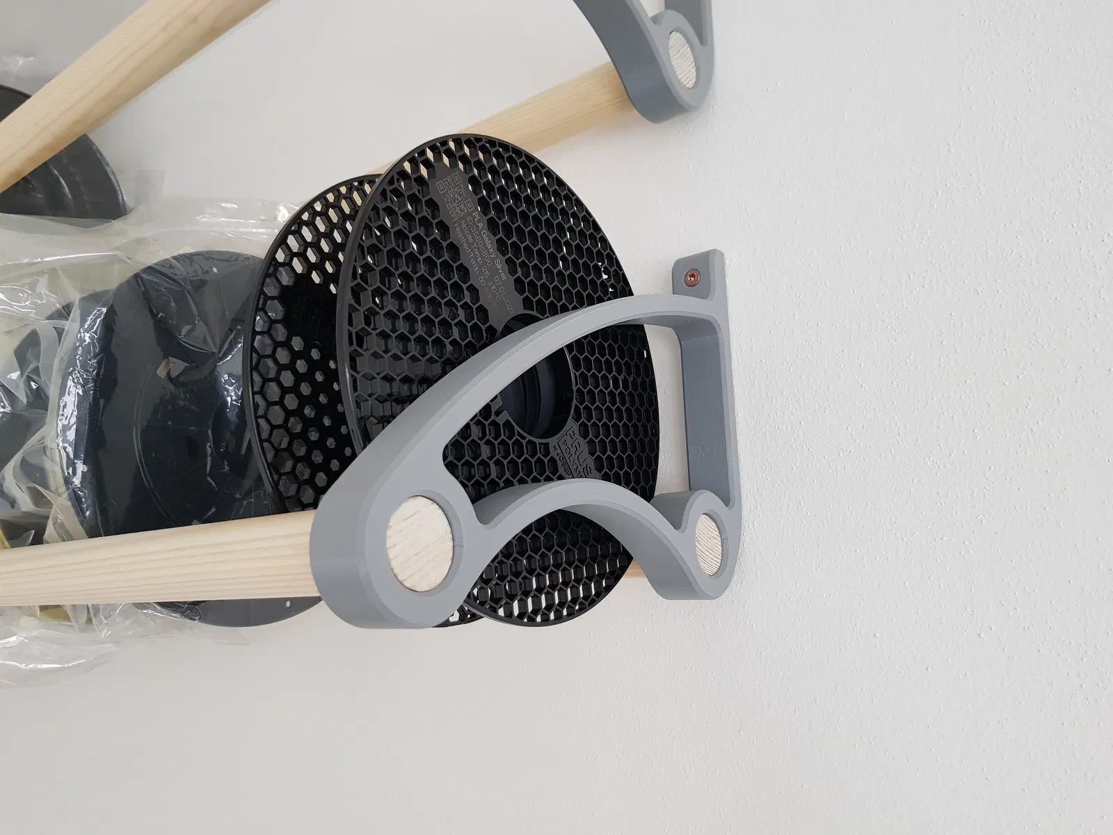 Giá đỡ (kệ) đựng sợi filament với thanh tròn 28mm. Đây là kích thước phổ biến của các thanh gỗ, ống nhựa và ống kim loại mà bạn có thể mua ở chợ đồ thủ công.