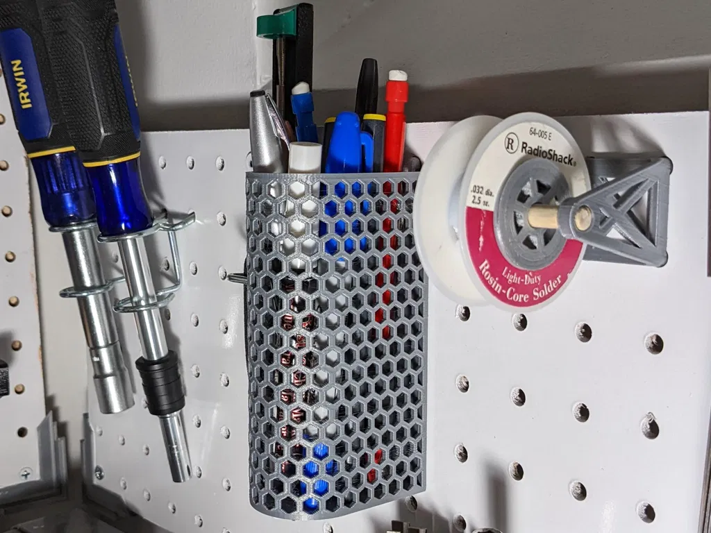 Giỏ treo bảng ghim hình tròn, cao, với thiết kế lưới hình lục giác cách điệu. Rất phù hợp để đựng bút, bút chì, hoặc các dụng cụ nhỏ khác, giúp bàn làm việc hoặc không gian của bạn gọn gàng và có tổ chức hơn.