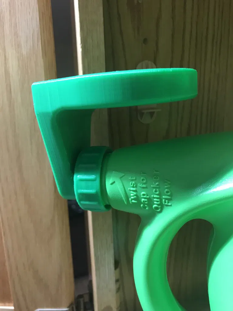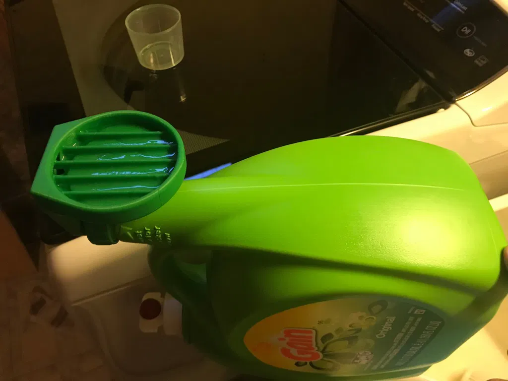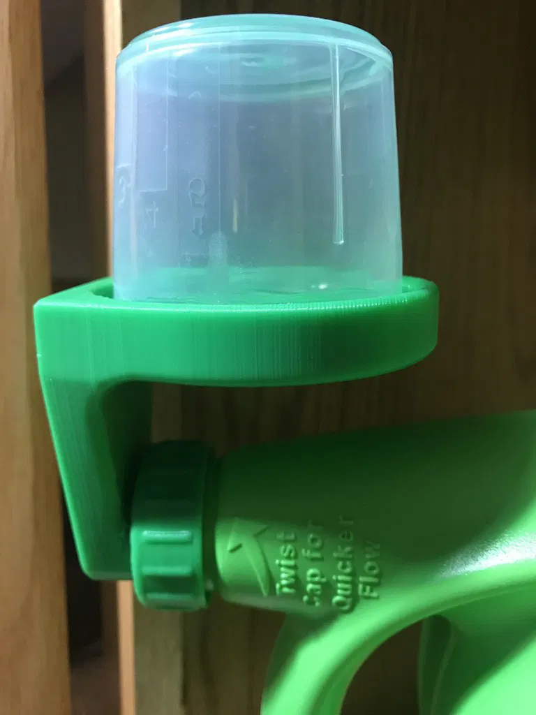 Thiết kế này dùng để chứa cốc đong bột giặt cho các loại chai nước giặt lỏng của Tide và Gain, đồng thời cho phép phần bột giặt thừa chảy ngược trở lại vào chai.