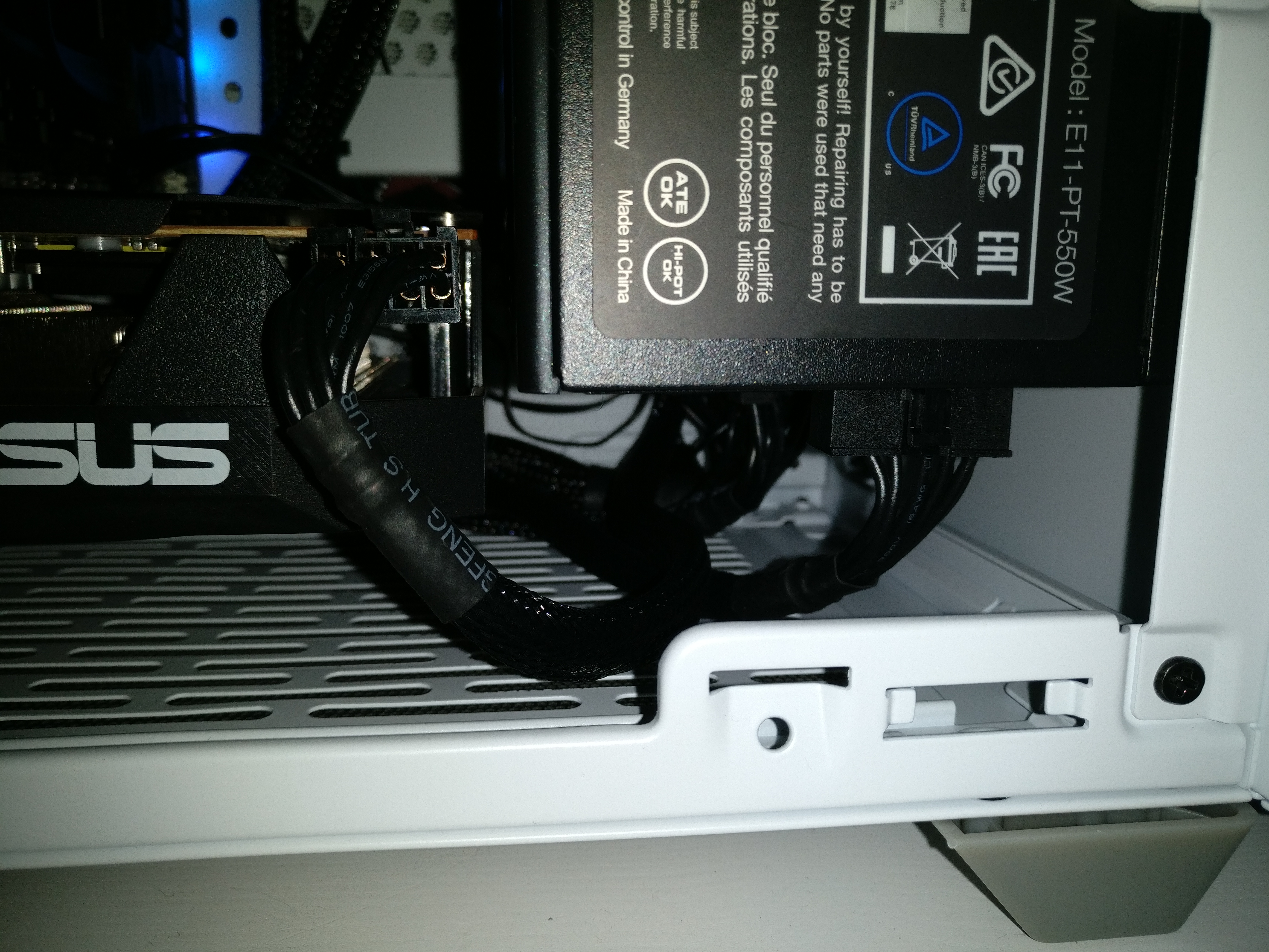 Nó dựa trên mẫu bạn có thể tải xuống trực tiếp từ trang sản phẩm của Cooler Master nhưng cung cấp thêm một chút không gian cho card đồ họa. Tôi đang sử dụng nó với card dài 242mm và còn vài mm để dự phòng. Đây là bộ nguồn 160mm và vẫn còn đủ không gian cho cáp bên dưới nó. Bằng cách chia thành hai phần, vẫn còn chỗ để luồn các đầu nối I/O mặt trước phía trên bộ nguồn và có một rãnh cho đầu nối HD Audio. Nó nằm ở vị trí thấp hơn nên có đủ chỗ cho cả hai quạt trên nóc vỏ case.