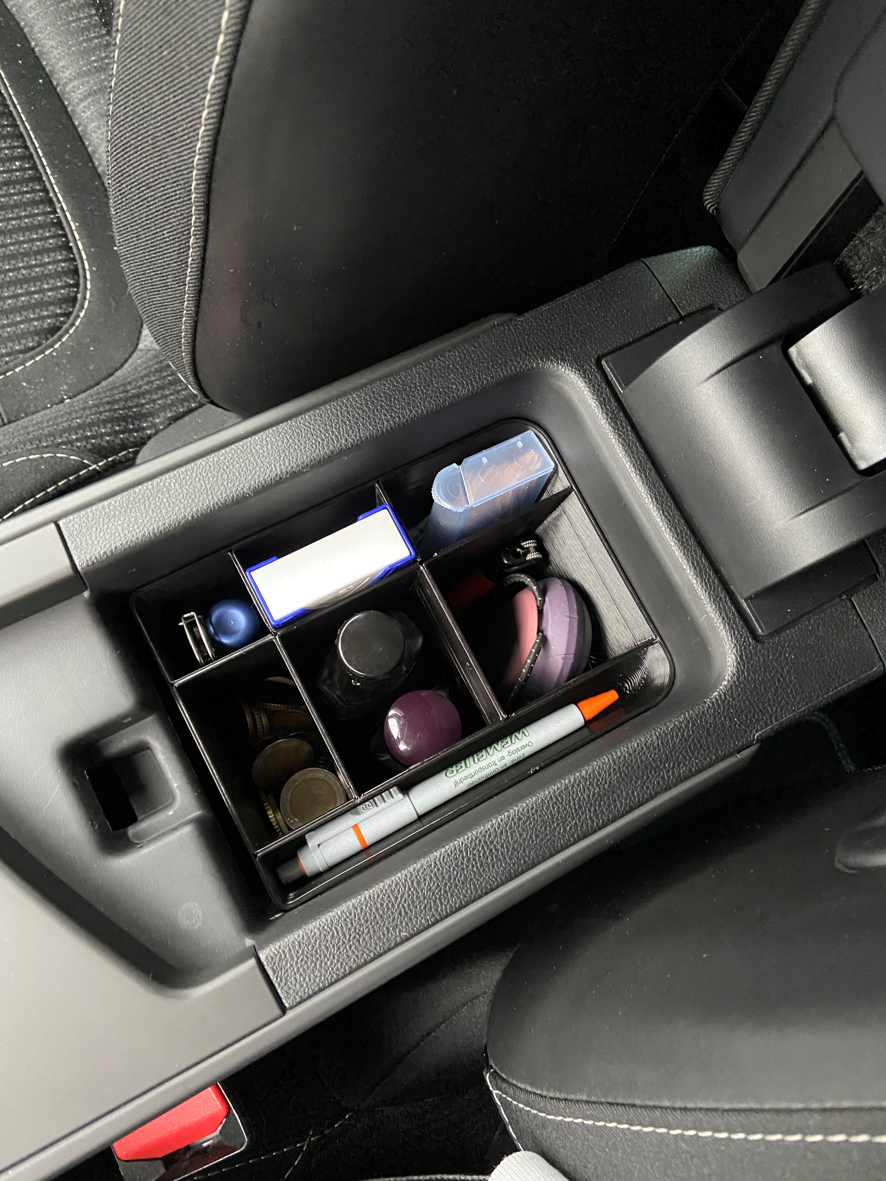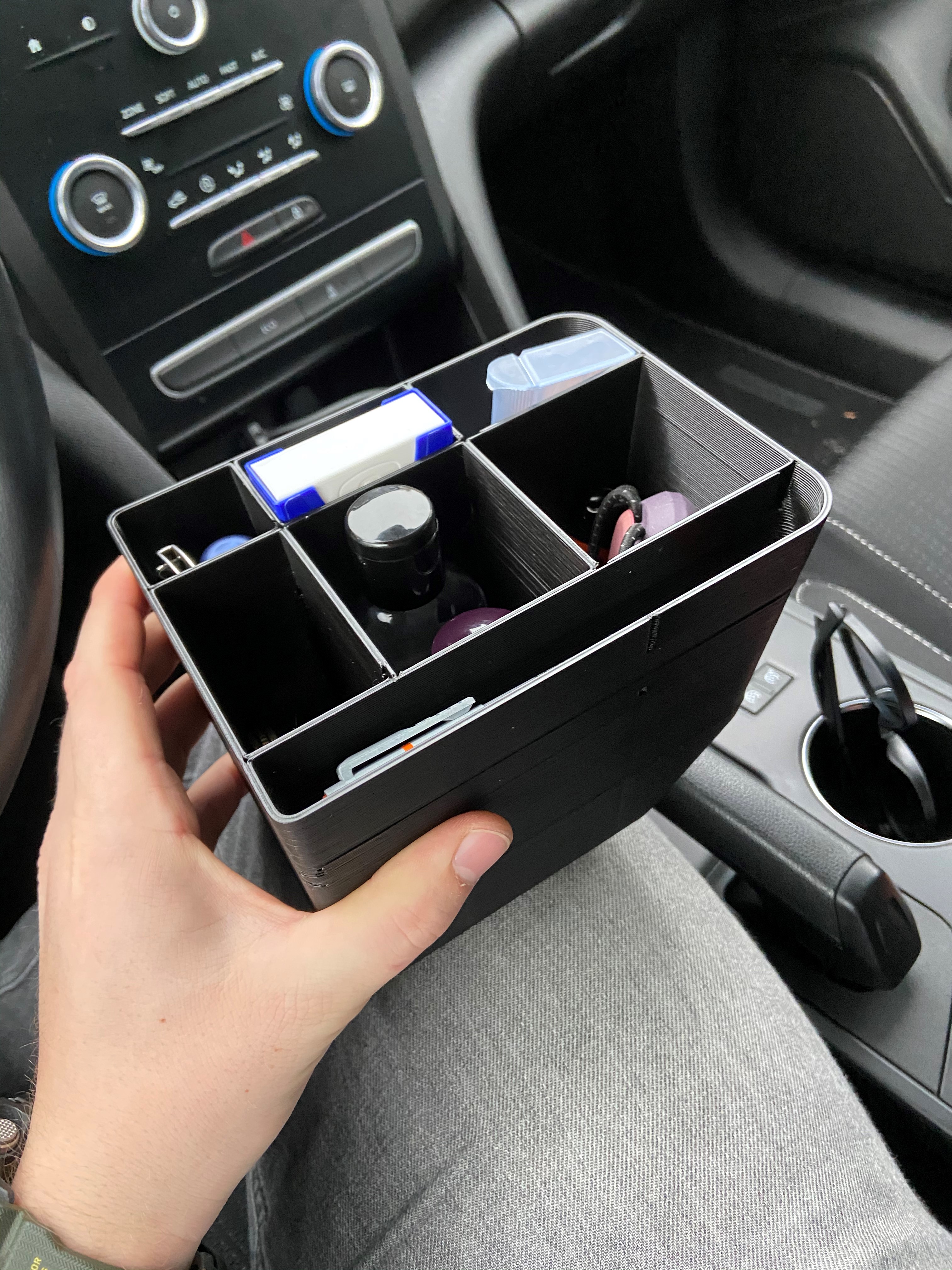 Đây là bộ sắp xếp đồ dễ in của mình, dành cho tất cả mấy món đồ linh tinh. Nó vừa khít với hộc chứa đồ dưới bệ tì tay. Bạn có thể để bút, tiền mặt/tiền xu và nhiều thứ khác nữa mà bạn muốn mang theo và giữ cho gọn gàng trong xe. Mình đã in bằng đầu phun 1.0mm nhưng bạn có thể dùng bất kỳ đầu phun nào bạn muốn.