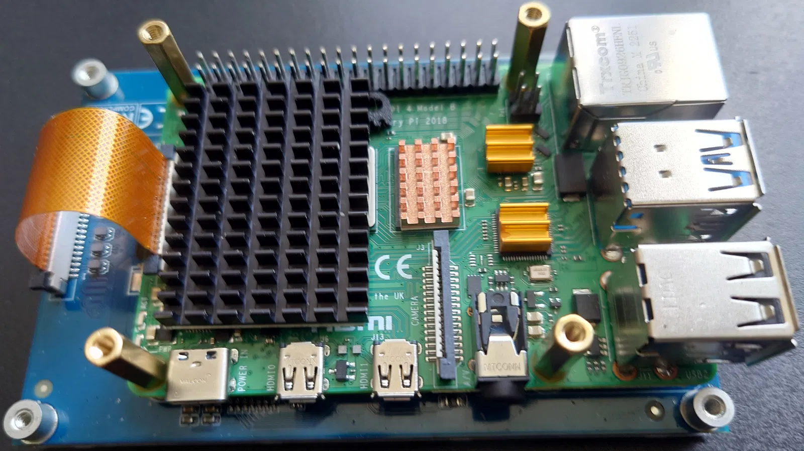 Sau đó, lắp ráp Raspberry Pi bao gồm thẻ nhớ microSD và tản nhiệt. Đảm bảo rằng tản nhiệt SoC không va chạm với các thành phần của POE hat. Gắn trực tiếp Raspberry Pi vào màn hình bằng các ốc đệm POE hat, không sử dụng các ốc đệm ngắn đi kèm với màn hình (chúng sẽ được dùng sau). Lắp cáp DSI và kiểm tra xem Pi và màn hình có hoạt động không.