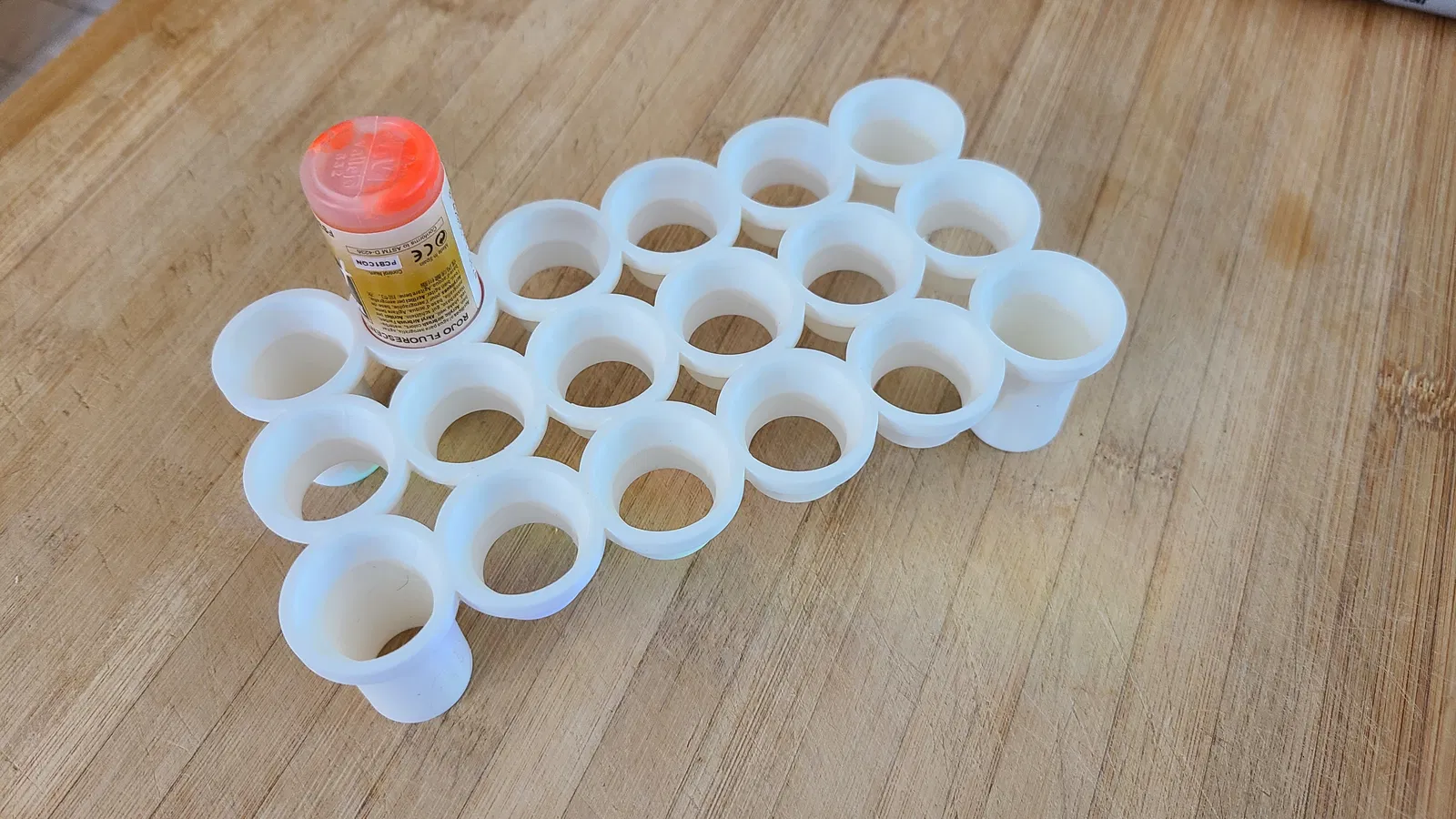 Bộ kệ 6 cái, chứa 108 chai sơn Vallejo 17ml, vừa vặn cho hộp Storage Box ArtBin 14.5"x15". Thiết kế thông minh, không rớt chai khi di chuyển. File FreeCad có sẵn.