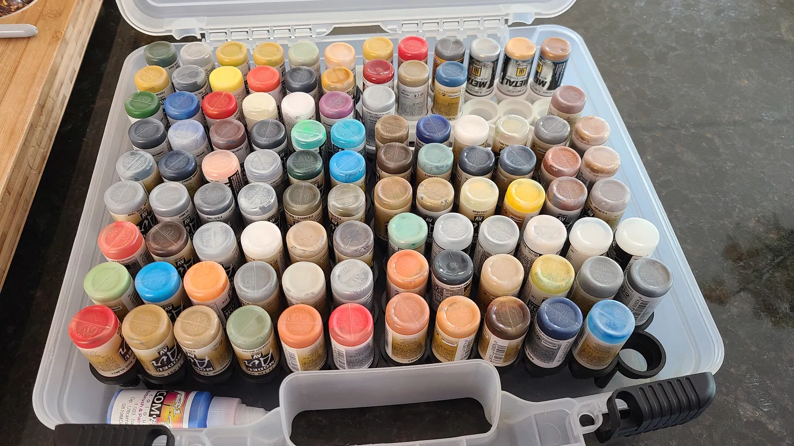 Một bộ gồm 6 cái, chứa được 108 chai sơn Vallejo 17ml (hoặc loại tương đương) trong hộp Storage Box ArtBin 14.5"x15" mã 6960AB (tui mua trên amazon nha).