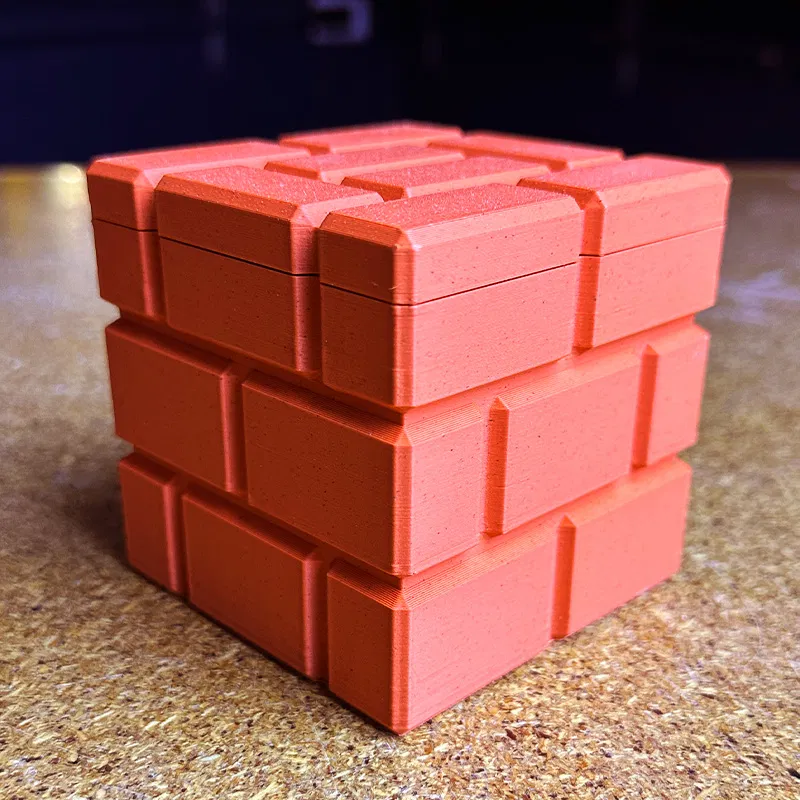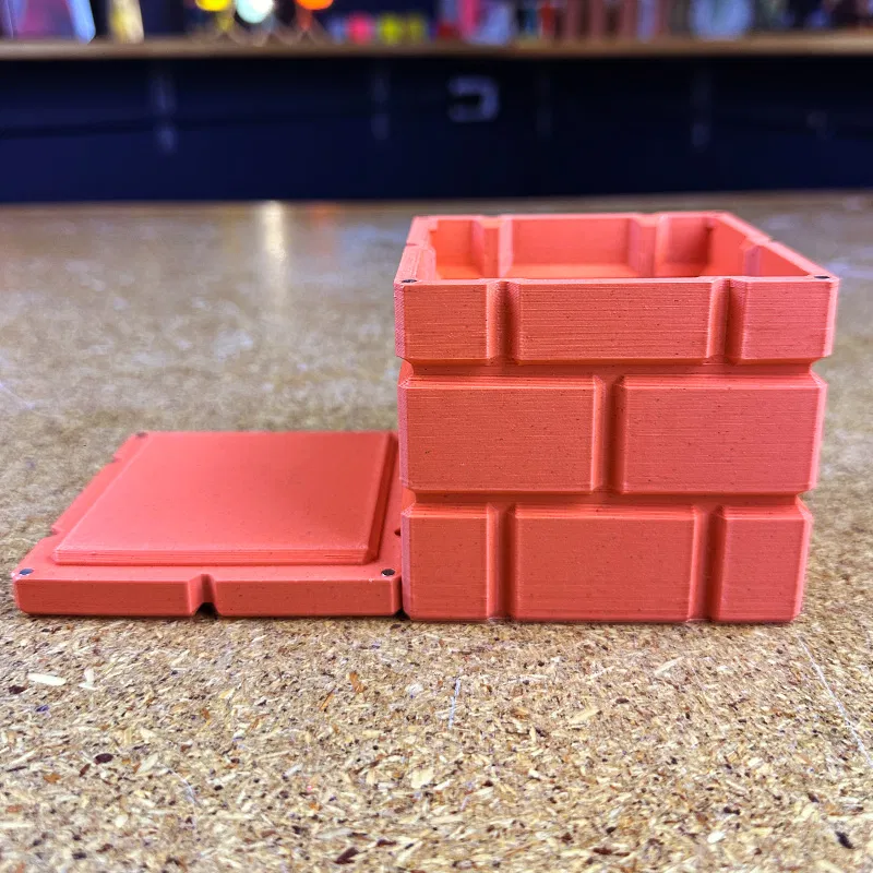 Tao làm cái Hộp Gạch Mario nhỏ này để chứa mấy món đồ lặt vặt nè. Kích thước của nó là 85 x 85 mm (3.35 in). In ra dễ lắm, không cần supports đâu.