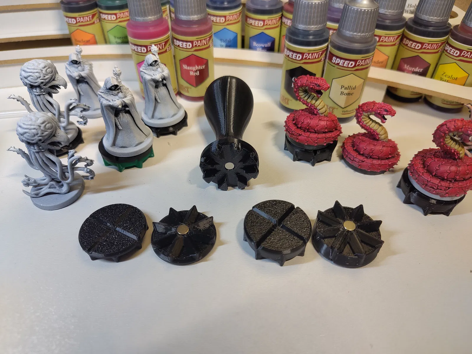 Có hai phiên bản đế tượng nhỏ, phiên bản dày dễ cầm hơn khi đổi tượng, phiên bản mỏng tiết kiệm PLA hơn. Các rãnh ở trên đế giúp Blu Tack bám tốt hơn, nhưng cũng có phiên bản không có rãnh.