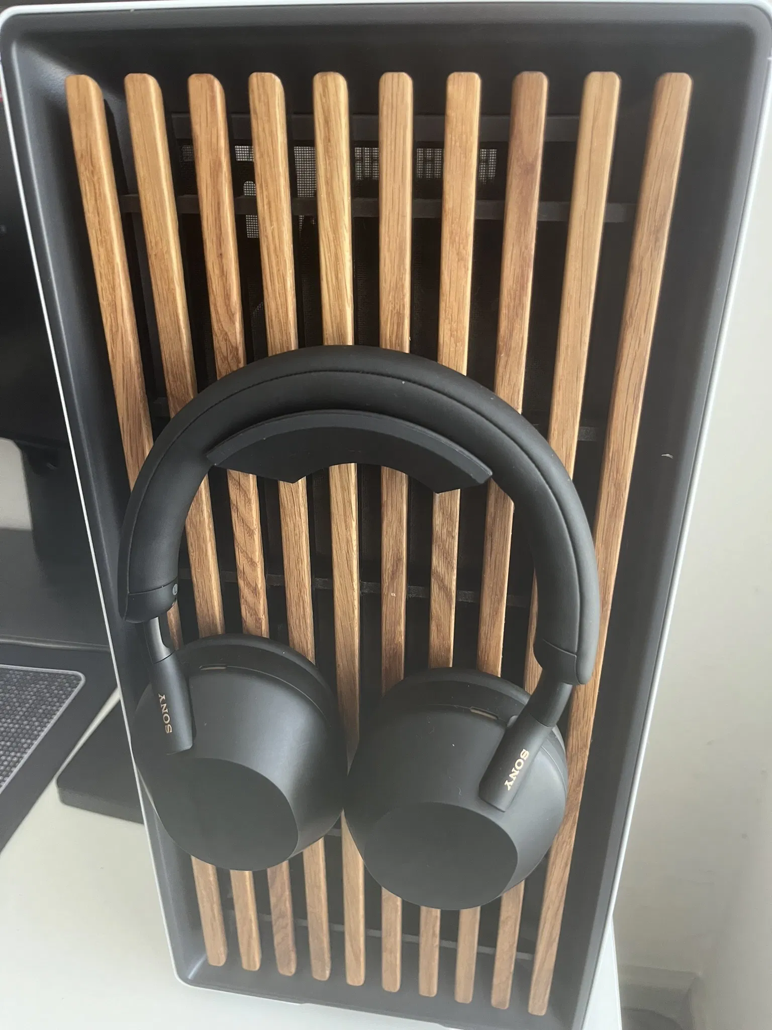 Giá treo tai nghe Sony WH-1000XM5 được thiết kế lại để treo lên mặt trước thùng PC Fractal North. Mẫu này là bản remix, thêm các móc treo tiện lợi. Lưu ý phần móc có thể dễ gãy và cần cải thiện.