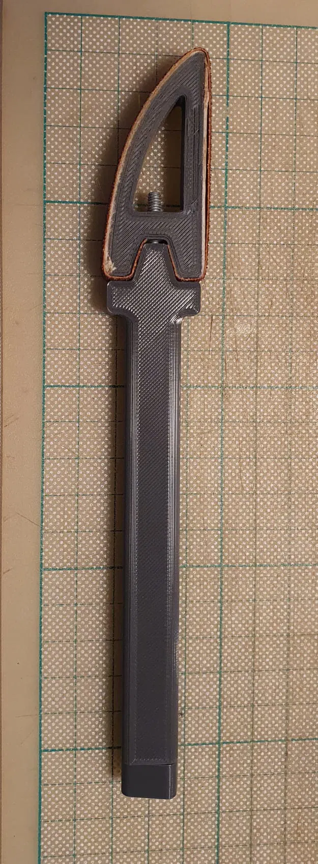 In ra các bộ phận. Tay cầm đặt ngang trên khay in. Dán băng keo mềm vào chỗ sẽ dán giấy nhám hoặc vải nhám (màu trắng trong hình). Cắt giấy nhám hoặc vải nhám rộng 10mm. Lắp ráp toàn bộ bằng thanh ren M4 và đai ốc. Nhỏ một giọt keo (siêu dính) để cố định các đai ốc vào các lỗ cắm. Chúc may mắn. Đây là một công cụ đã được chứng minh.